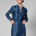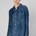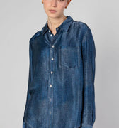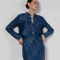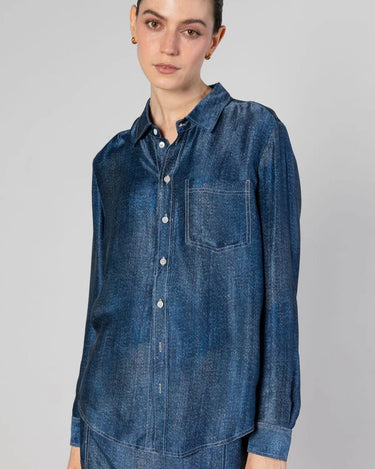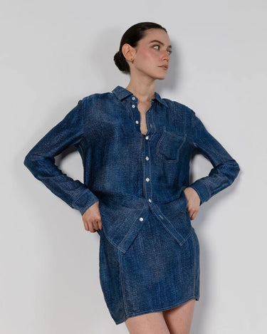 Our Austin Shirt is bias cut shirt that gently flows along the natural feminine silhouette. Contrast off white double stitching for an authentic denim look without the heavy weight of denim. Complete with French seams and tailored cuffs. A wardrobe elevated essential that you will wear on repeat. Ps; we love to team with a matching mini skirt.