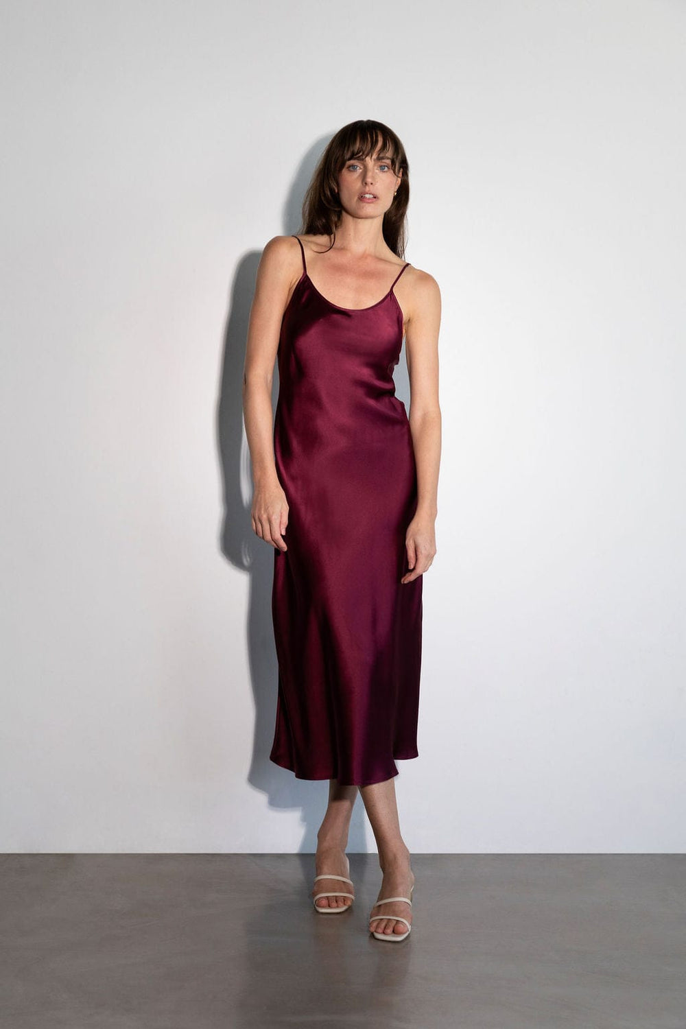Flattering & easy to wear. Bias cut to accentuate the female body shape. Featuring a scoop neckline. Complete with spaghetti adjustable gold accent straps for a perfect fit & finished with French seams. Maxi length.