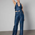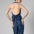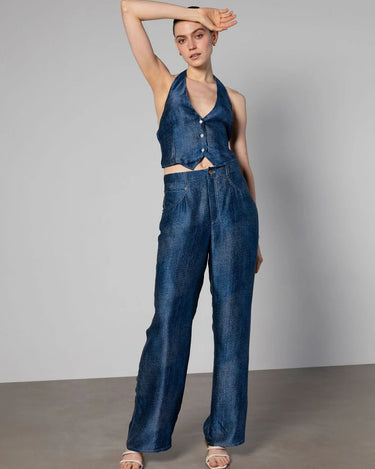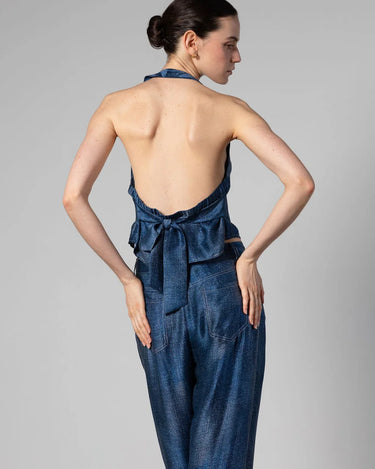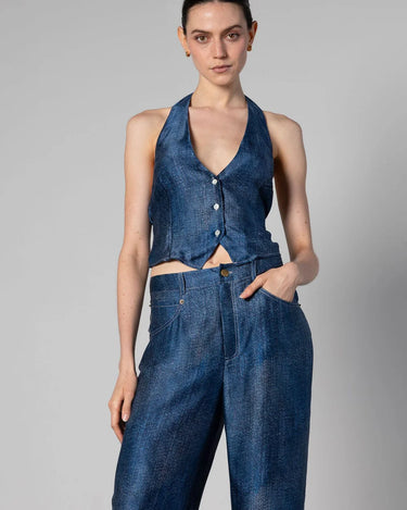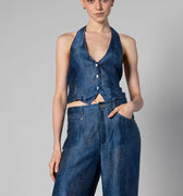 Button down front halter with an elasticated back with tie for a form fit finish complete with a double lined collar.