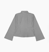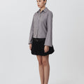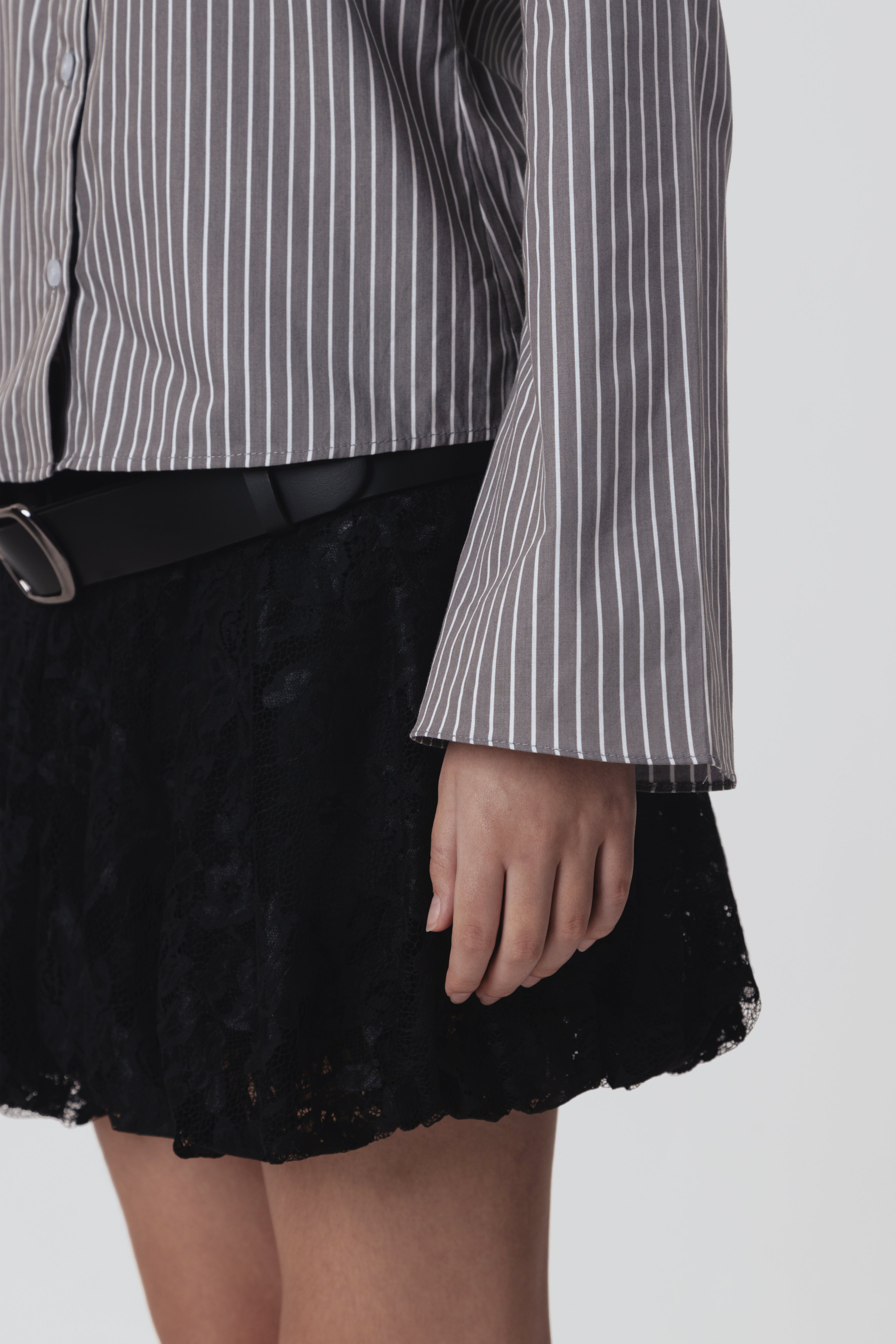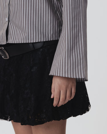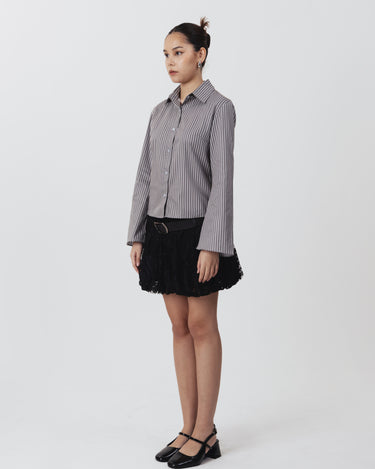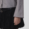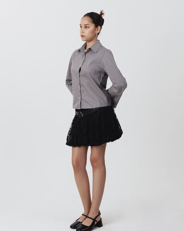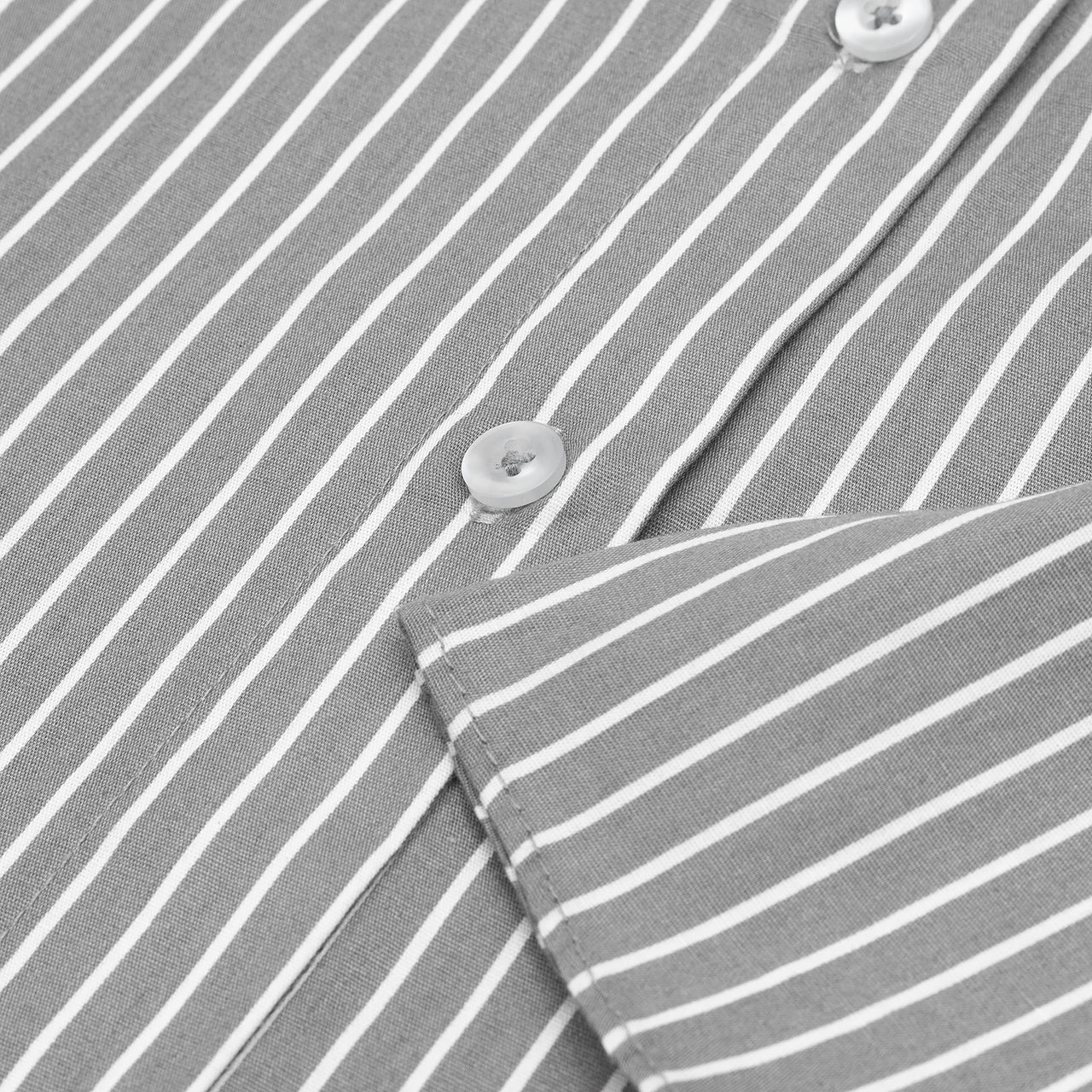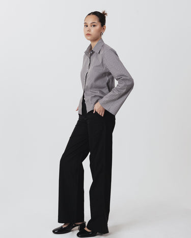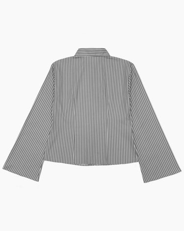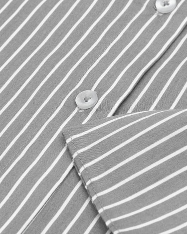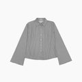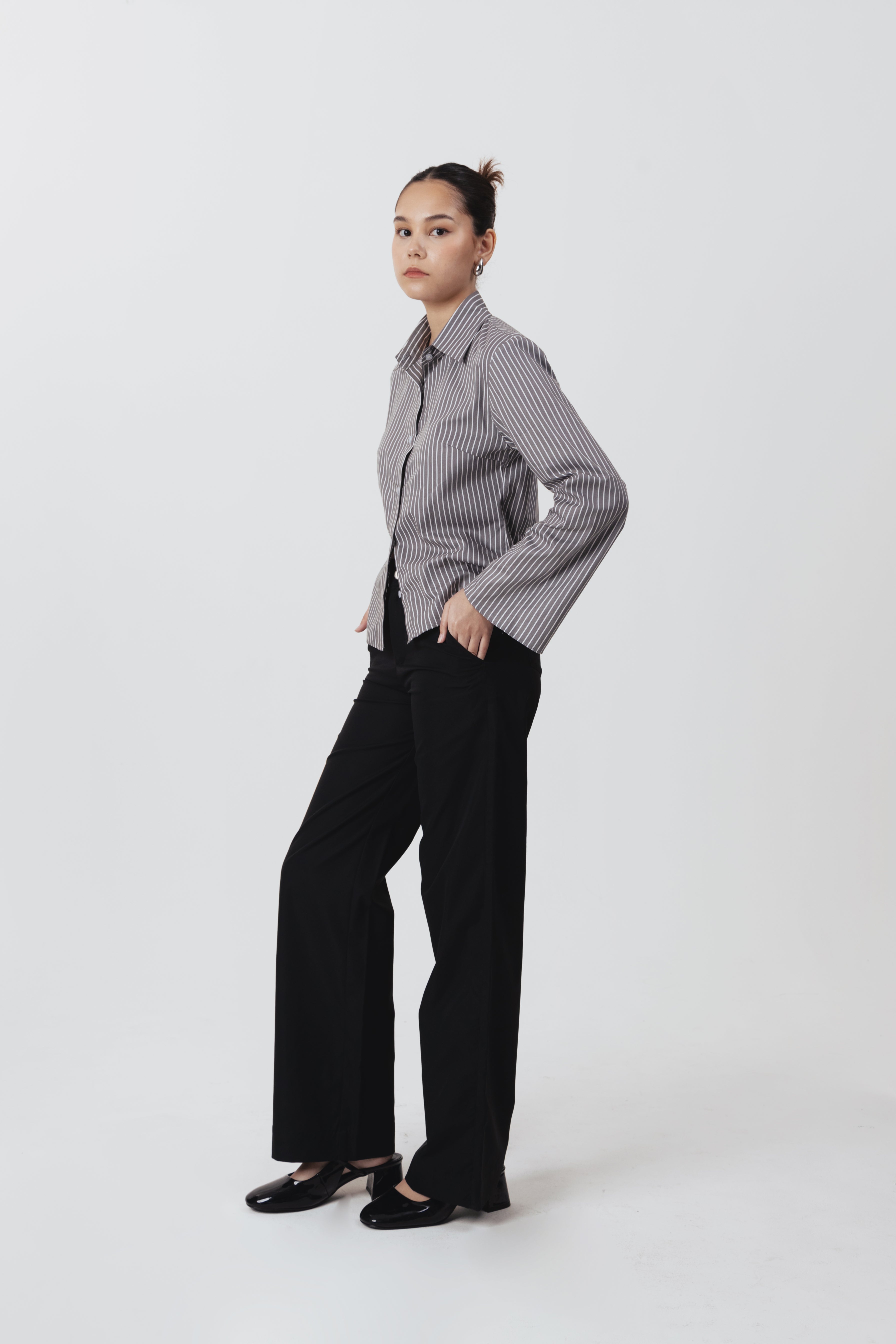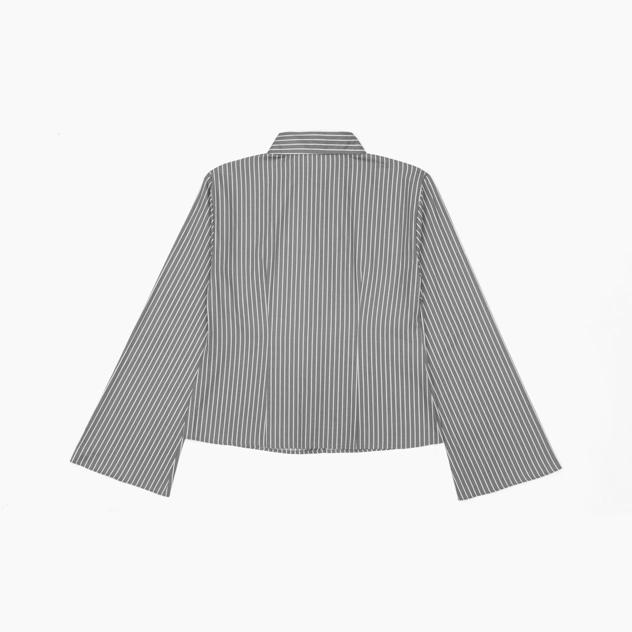 Elevate your wardrobe with the Provence Shirt! This gray striped shirt boasts a tailored waist and flared cuffs for a sophisticated and flattering fit. Perfect for office or any occasion.
