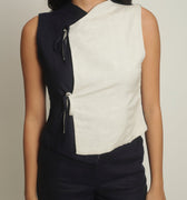 The Calista Crop features a raised collar with ribbon details. There are hidden automatic closures for a more secure fit. The Calista Crop can be styled closed or open and sports a relaxed fit. Best paired with the Margot or Anya Pants. Made in Linen.