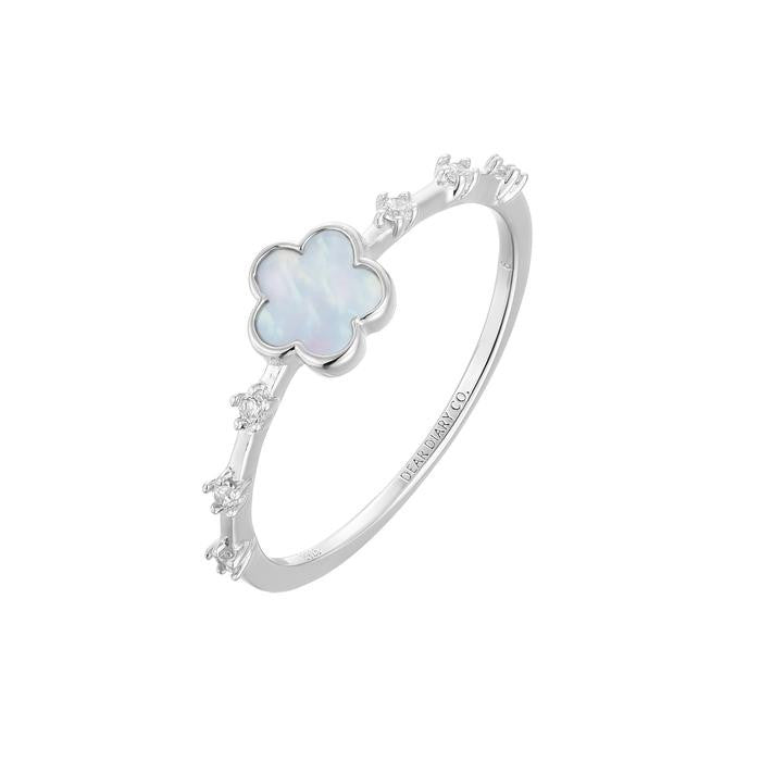 Flora Ring carries a centerpiece, a Mother of Pearl shell flower, symbolising the reunion of a family. On each side, three sparkling stones shimmered like sparkles in the evening sky, connected by our hearts.
