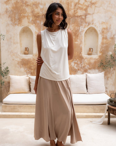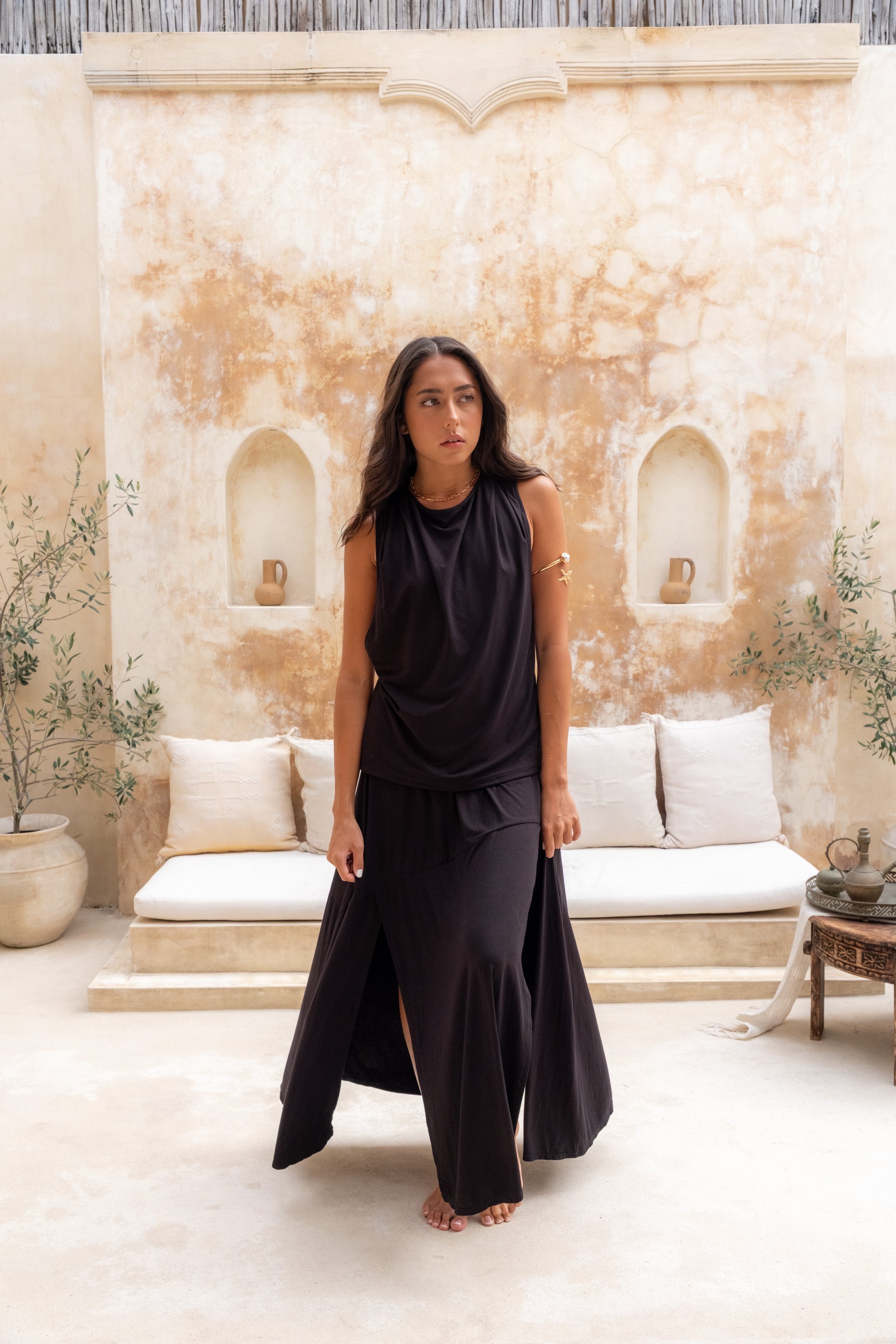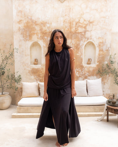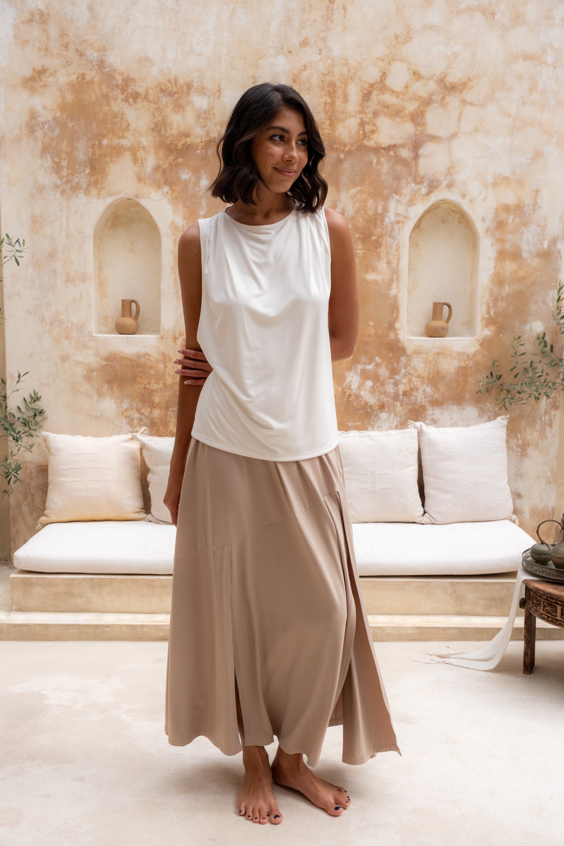A statement in motion. The Freya Skirt is a double-slit, bias-cut piece that drapes beautifully with every stride. The bamboo fabric gives it a soft, fluid texture that catches the light and contours naturally to your frame.