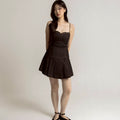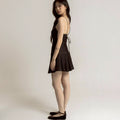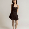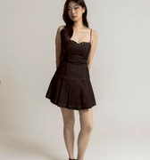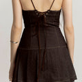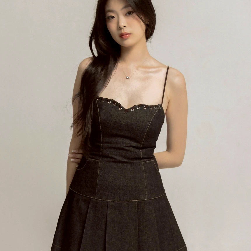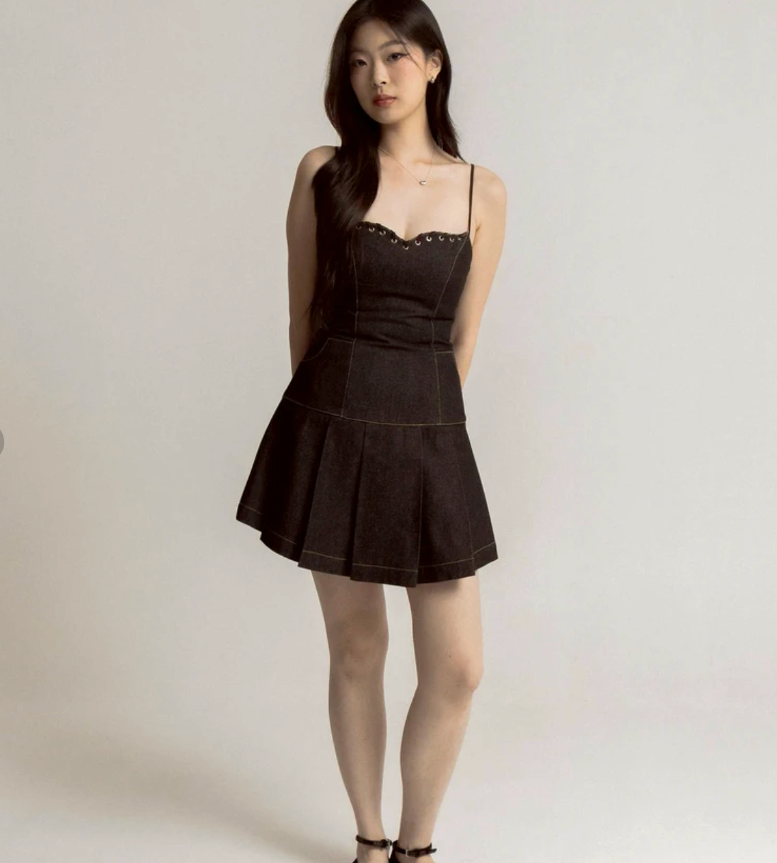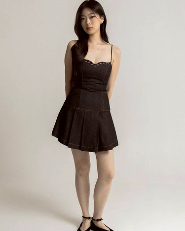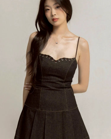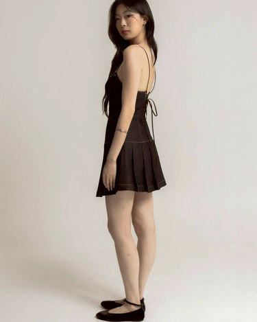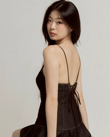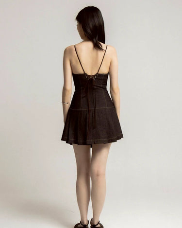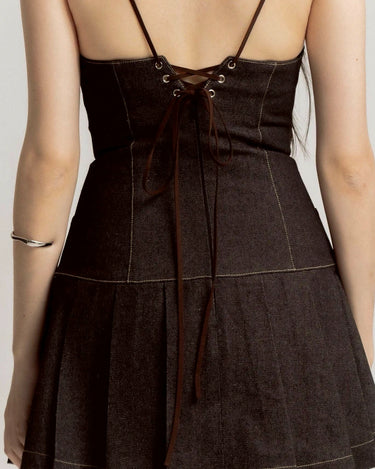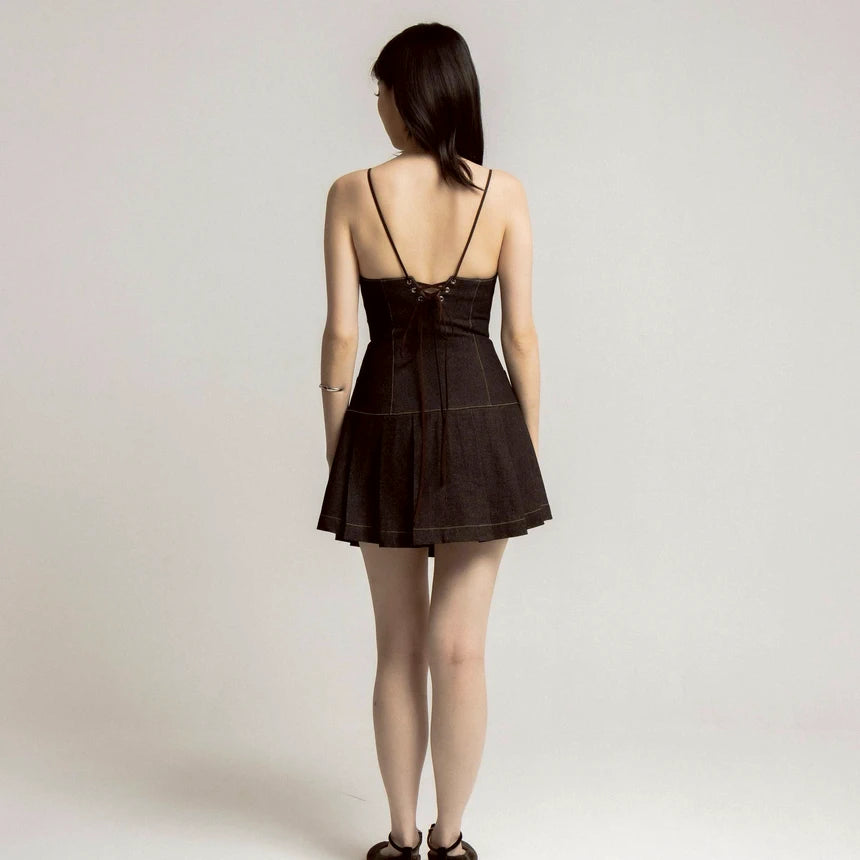 Denim mini dress with pleated skirt and cream top stitching detail. Suede laced detailing at neckline connecting to the laced-up back. Adjustable straps.
