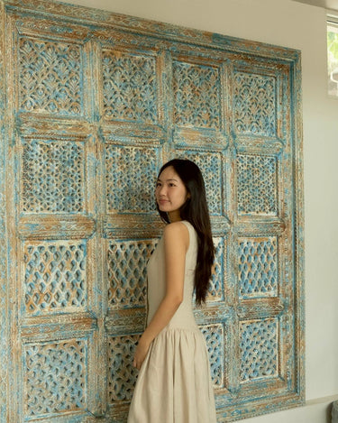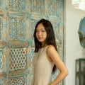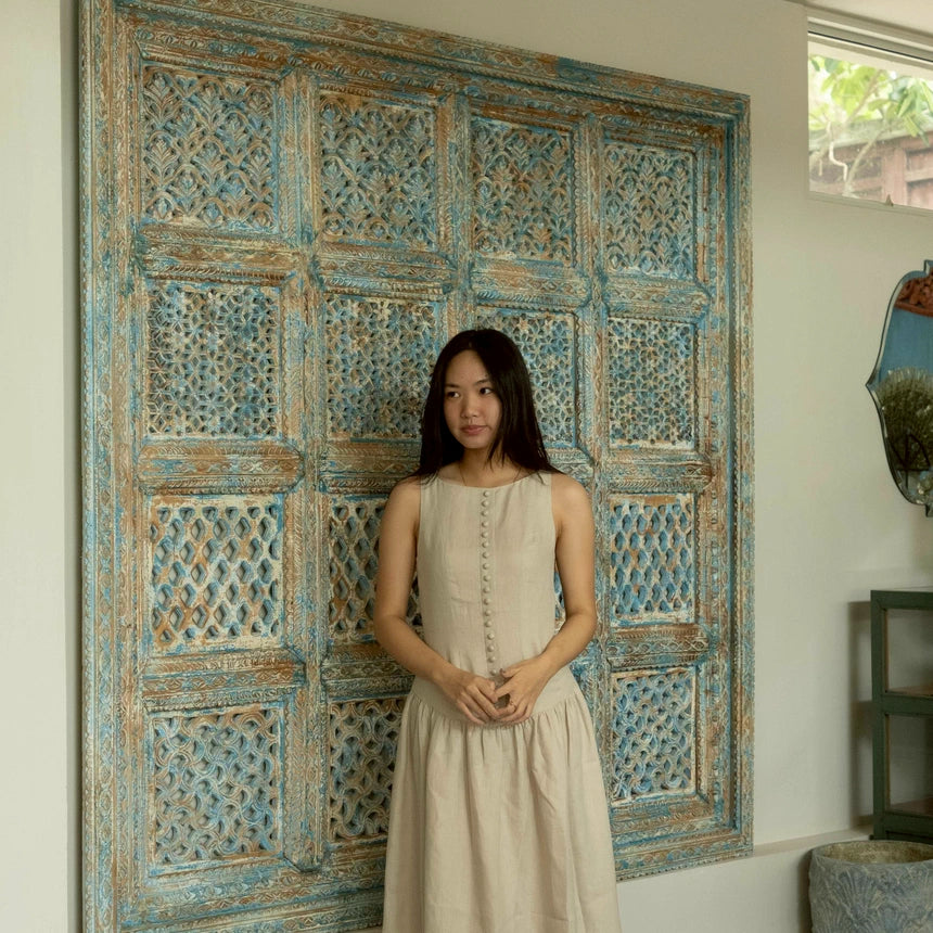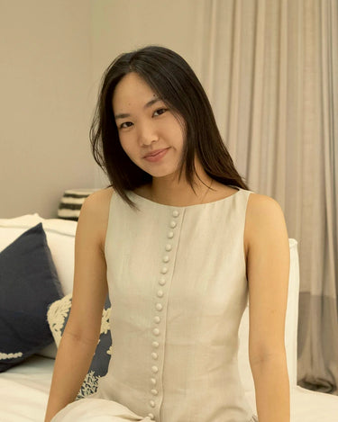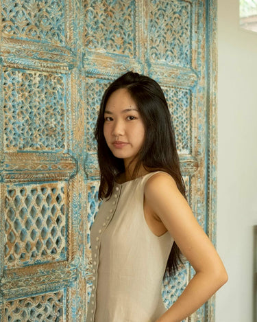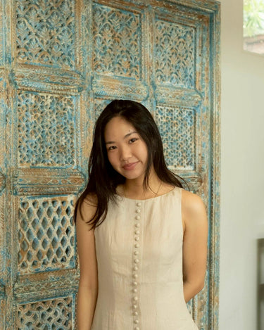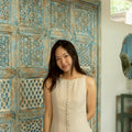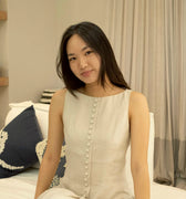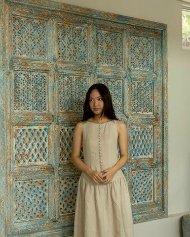 Fully Linen soft boat-neck midi dress with buttons detail and gathered skirt. Zip closure.