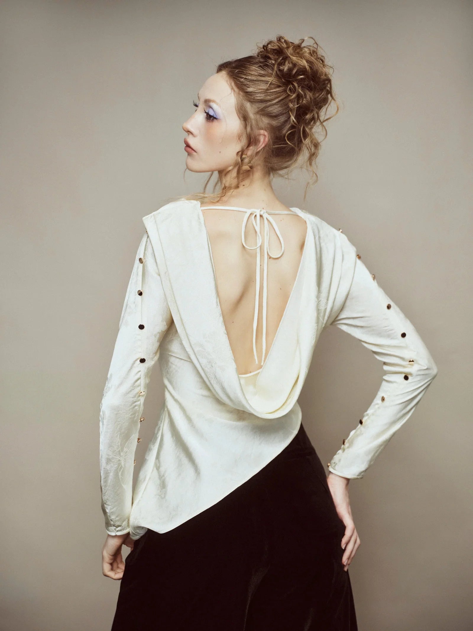 Crafted with a softly structured silhouette, it features an elegant boat neckline and a sculpted asymmetric hem that flatters the waistline. The dramatic open back drapes effortlessly and ties delicately at the neck, revealing a hint of skin while maintaining an air of sophistication. Finished with subtle floral textures and button details along the sleeves, this piece embodies modern femininity with a timeless sensibility.