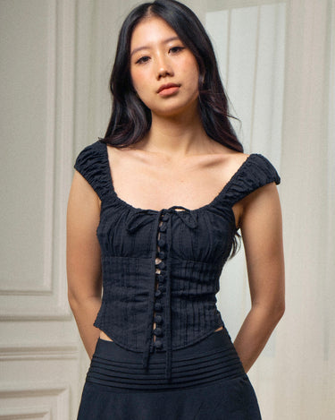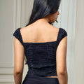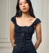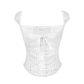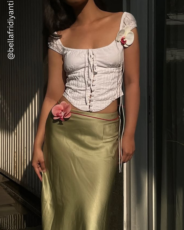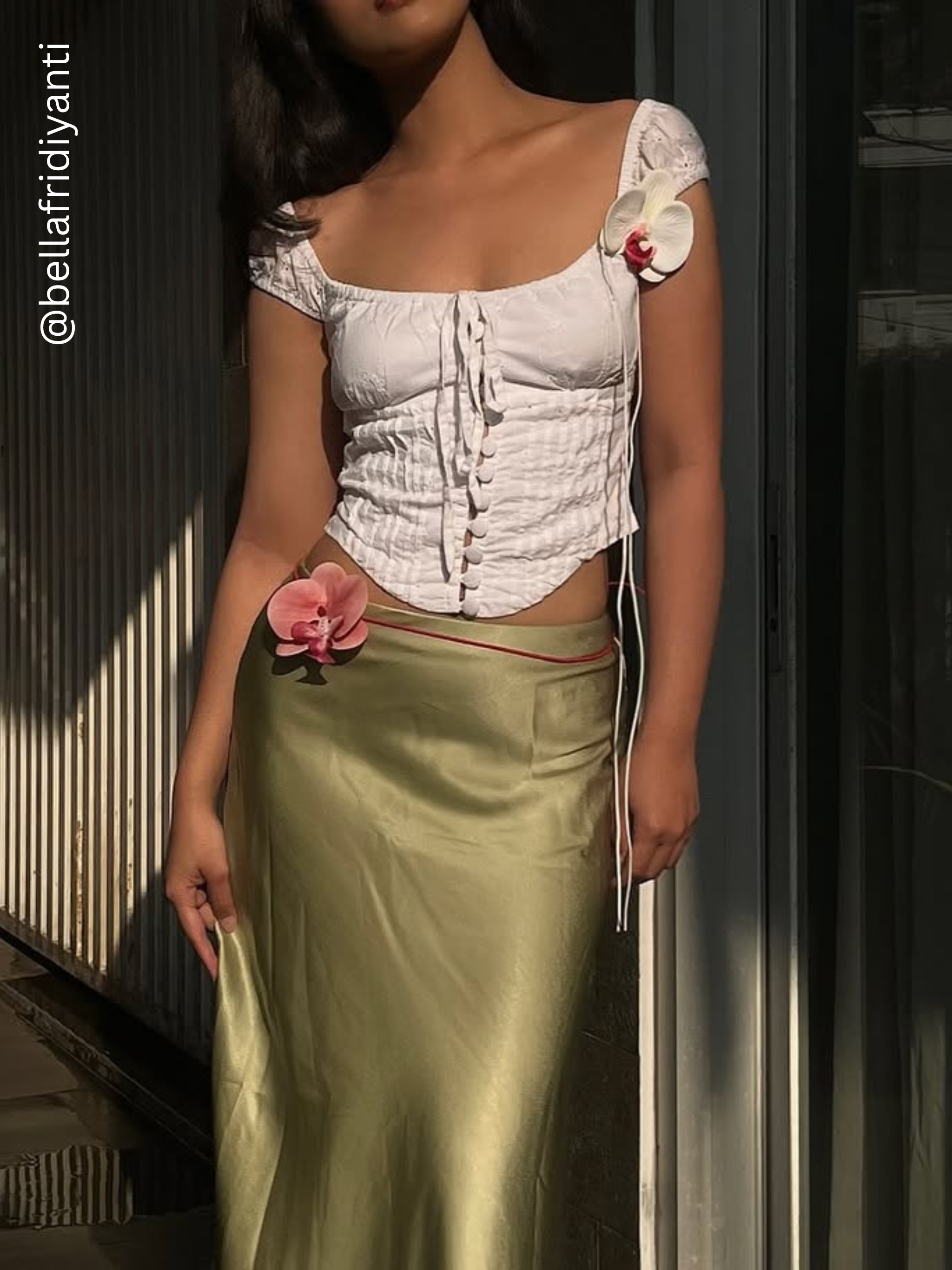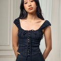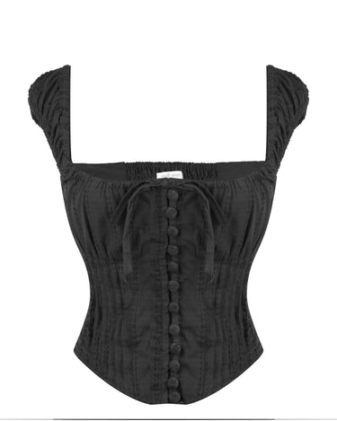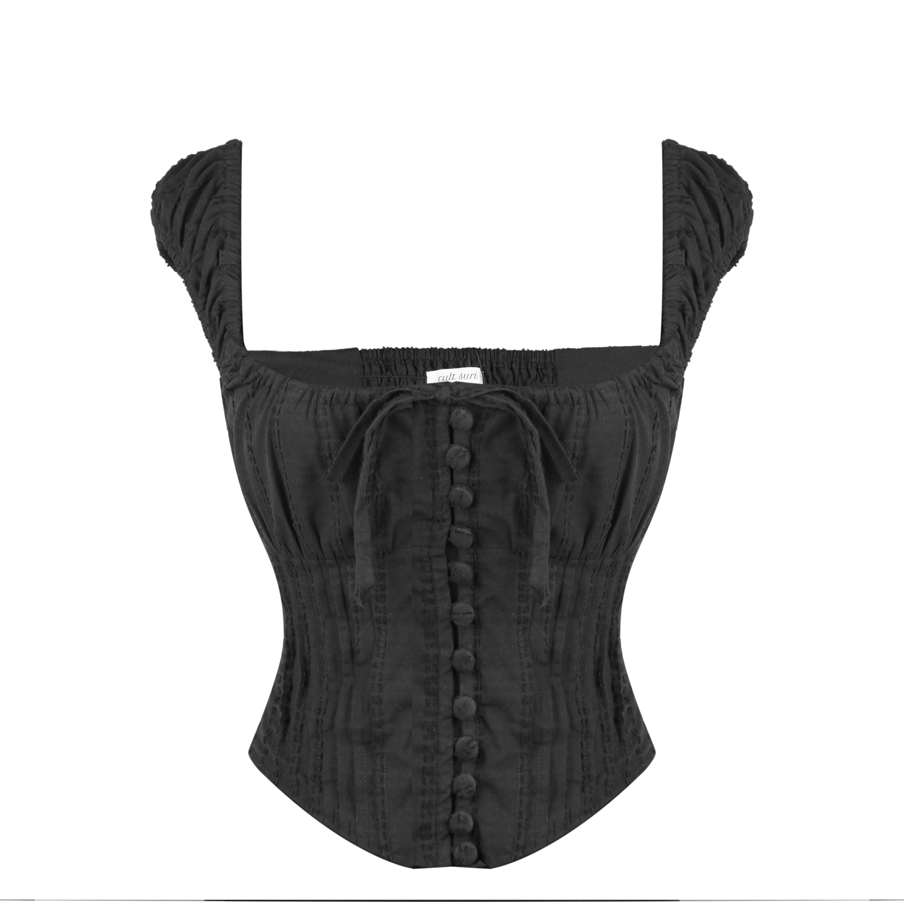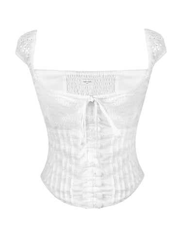 Dainty milkmaid top made of 100% eyelet cotton. Sleeves can be worn on or off shoulders and back is elasticated with a side zip. Note: The pattern of the cotton eyelet may differ between batches as it is a deadstock fabric. To see the most recent pattern please contact us.