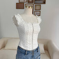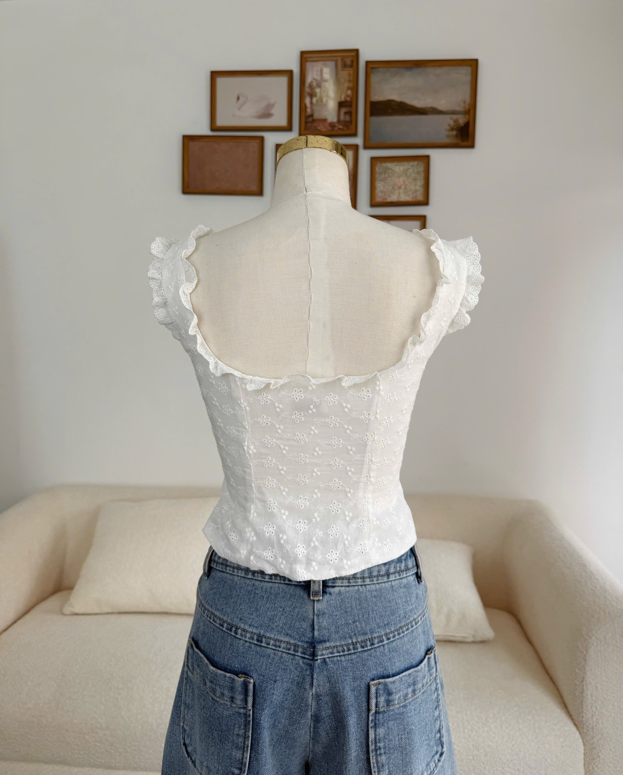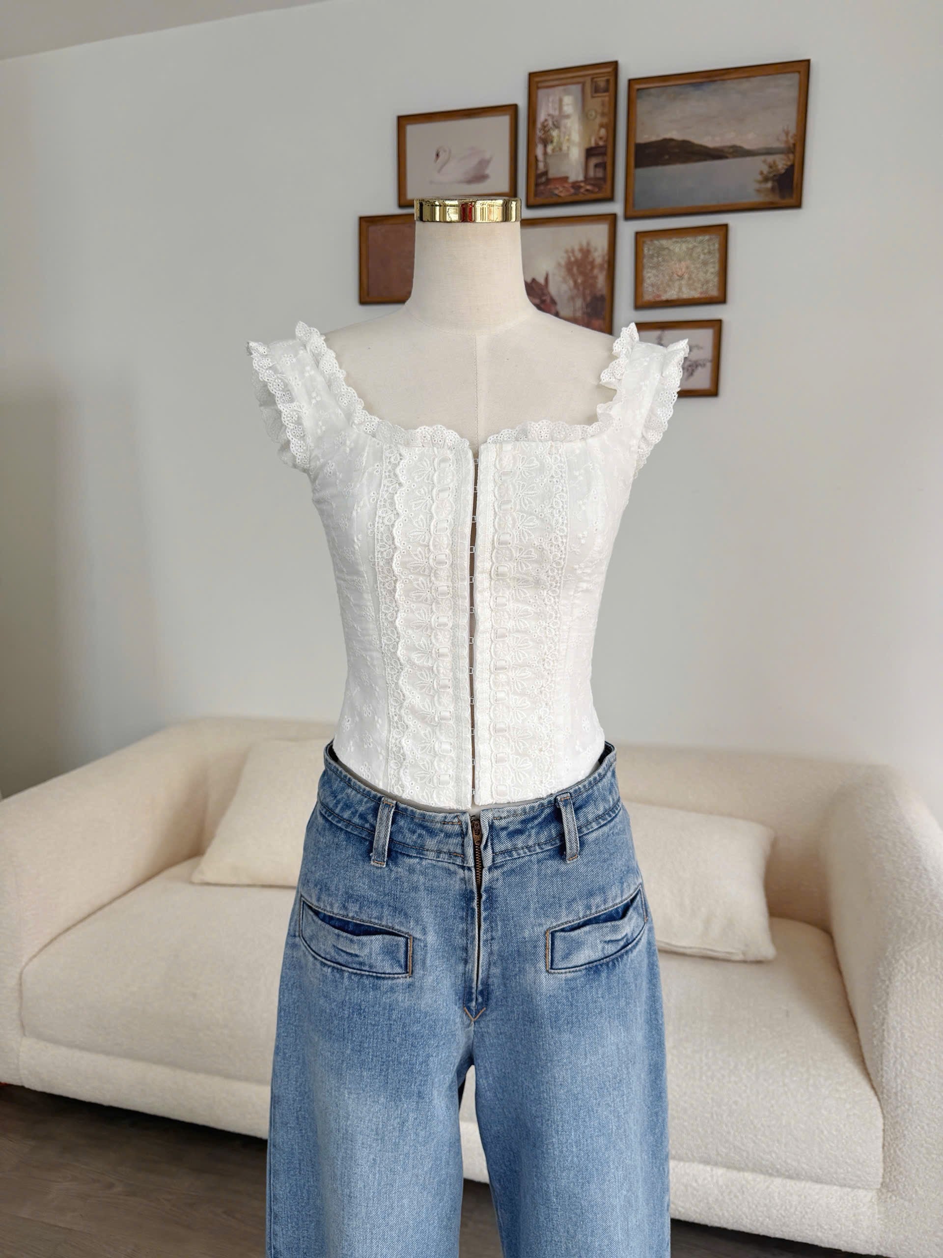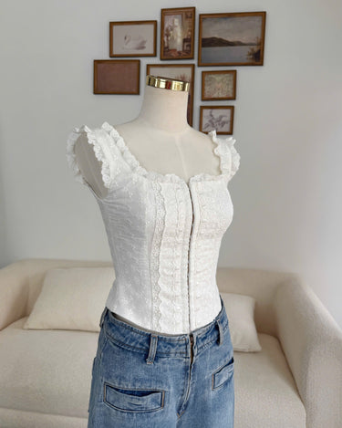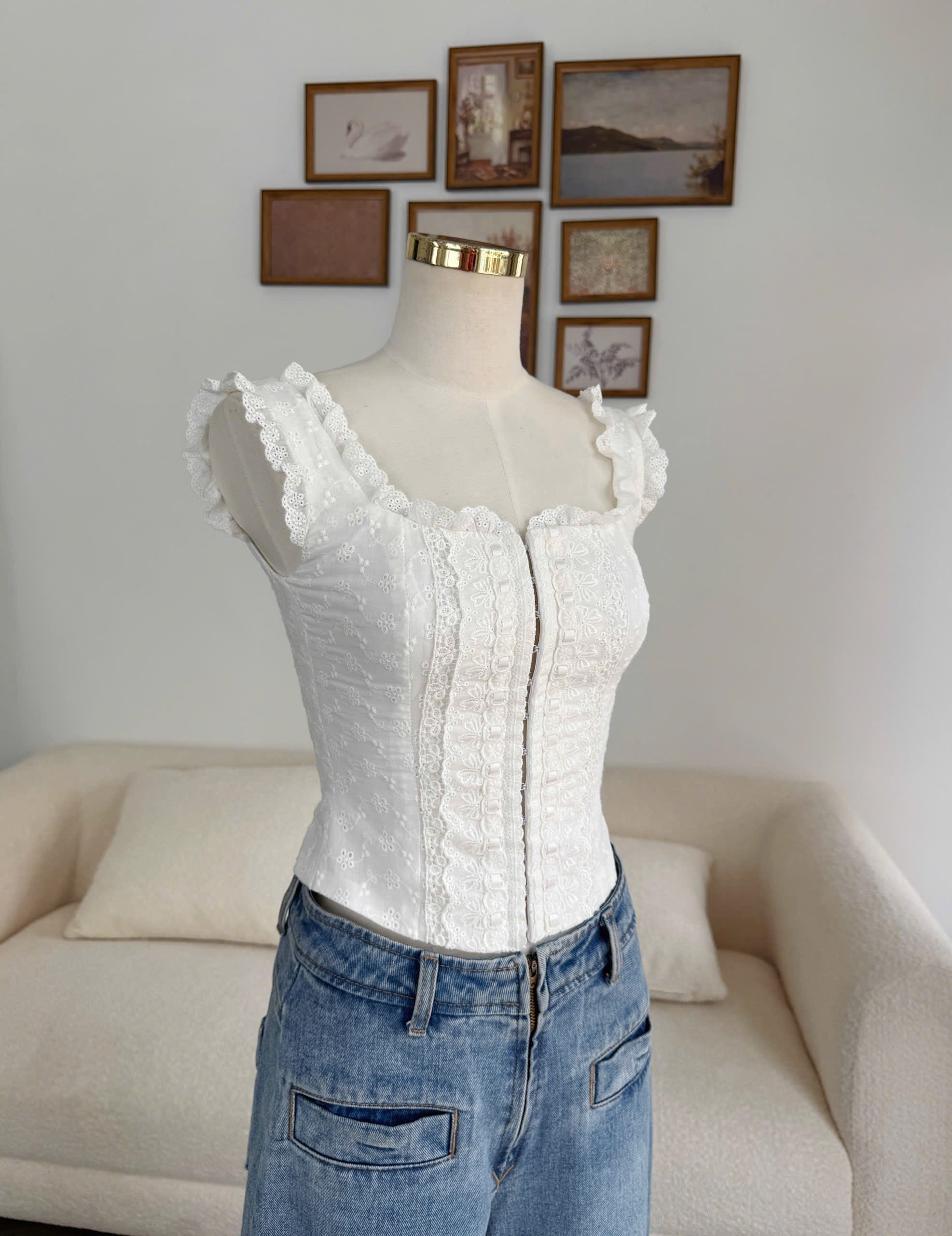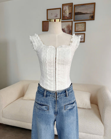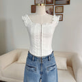 The Morri Top – Black is a vintage-inspired lace-trimmed corset top designed to elevate your feminine silhouette. Featuring delicate lace inserts, eyelet detailing, and ribbon accents, this structured mini top offers a romantic yet flattering fit — perfect for pairing with high-waisted bottoms.