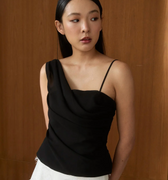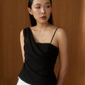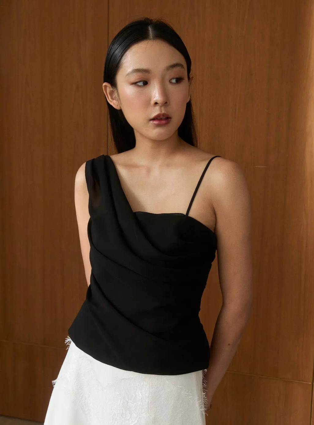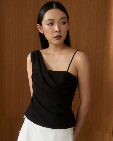 The Whisper Top is crafted from draped black chiffon over a cotton-linen inner that flows seamlessly from front to back. Its asymmetric neckline and gently flared hem create a refined, romantic silhouette.