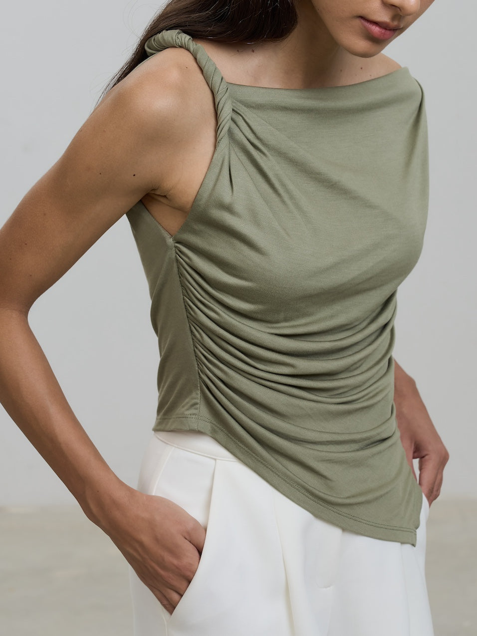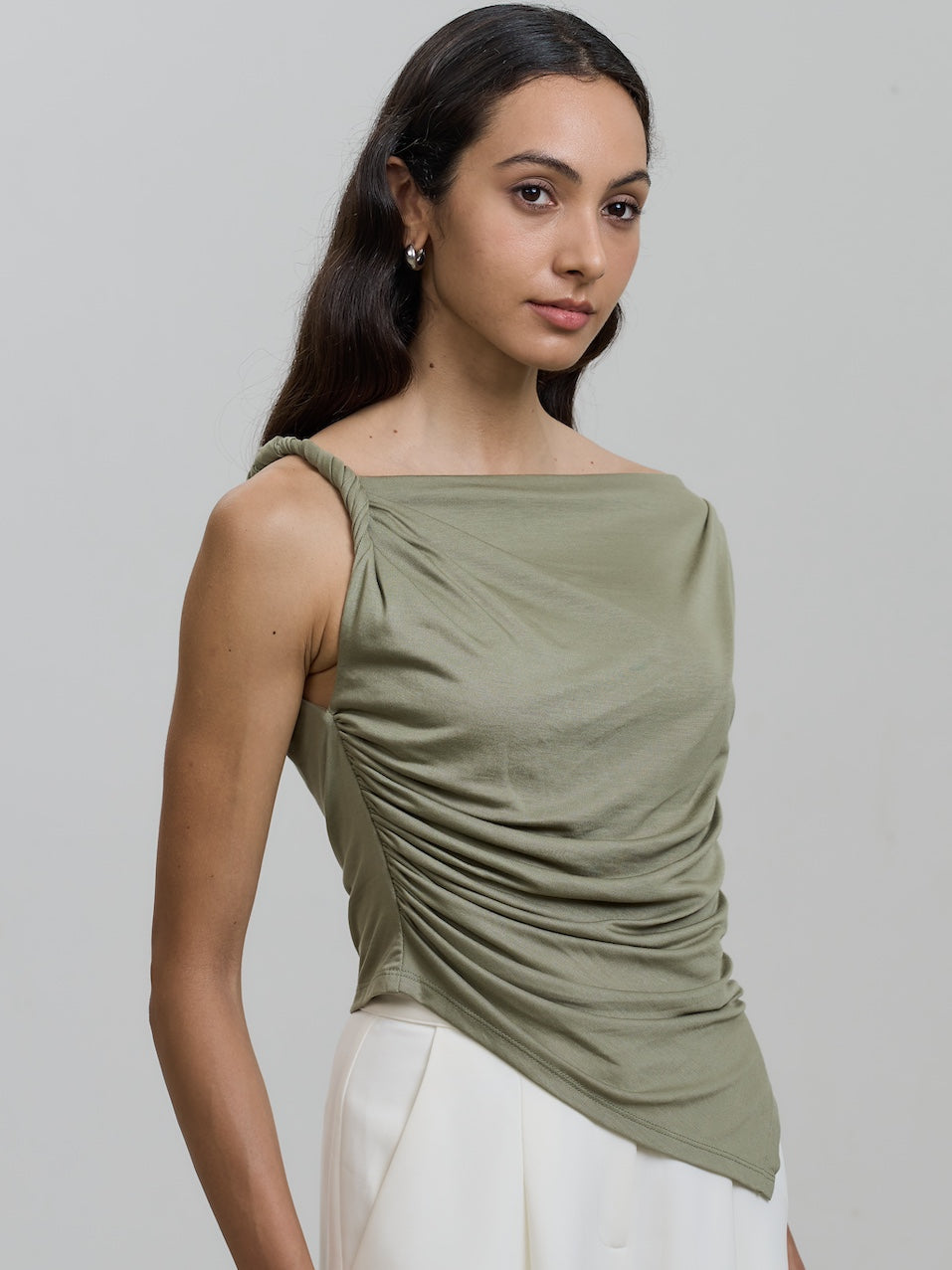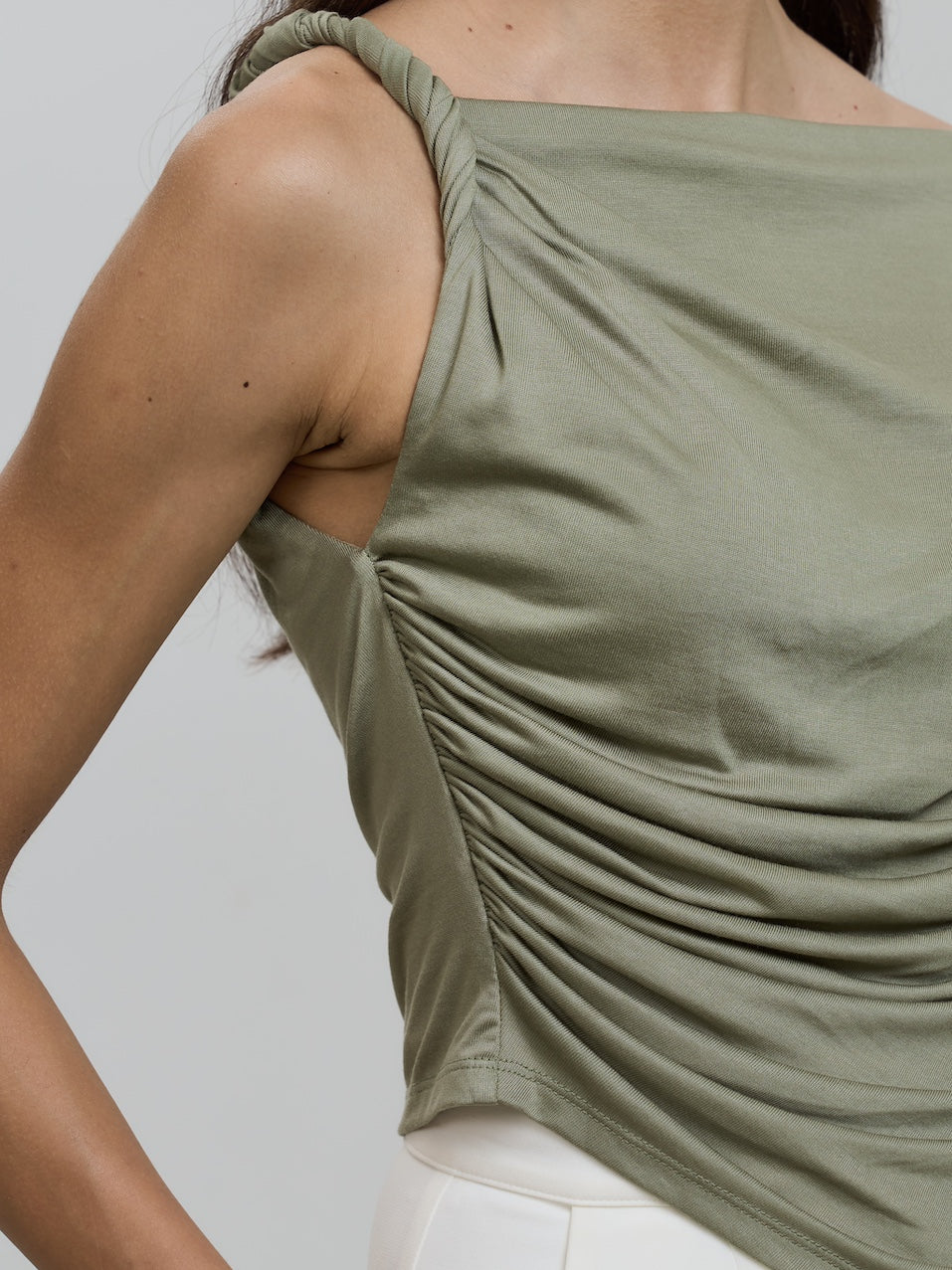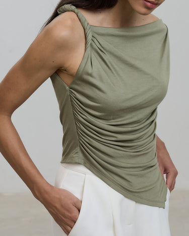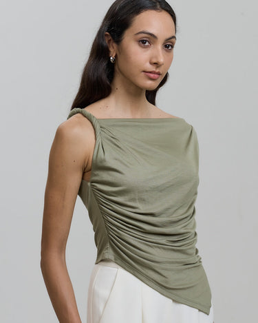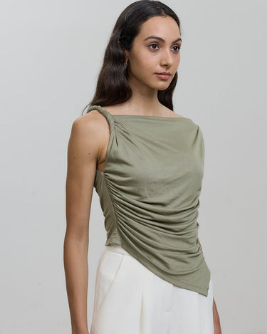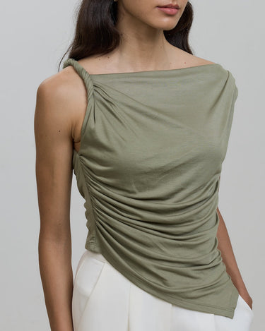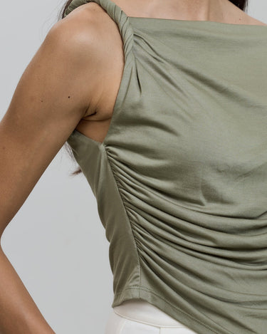 With its chic off-shoulder design and twisted knot detail, this top exudes elegance and sophistication.