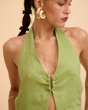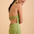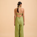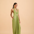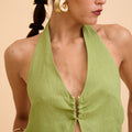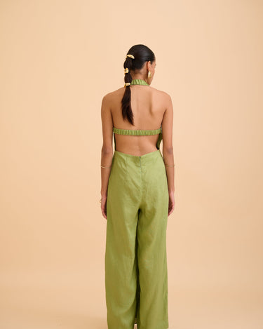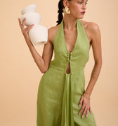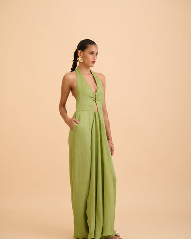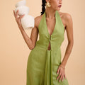 A study in effortless elegance. The Anika Cut-out Jumpsuit features a graceful halter neckline adorned with a subtle gold accent at the front, adding a whisper of refined shimmer. Draped fabric flows gently over the body, creating movement and softness, while the backless design reveals a hint of skin with quiet confidence. Lightweight and breathable, it’s a timeless piece designed for moments that linger—where ease meets sophistication. Wear it alone or layered, made for slow evenings and golden hour escapes.
