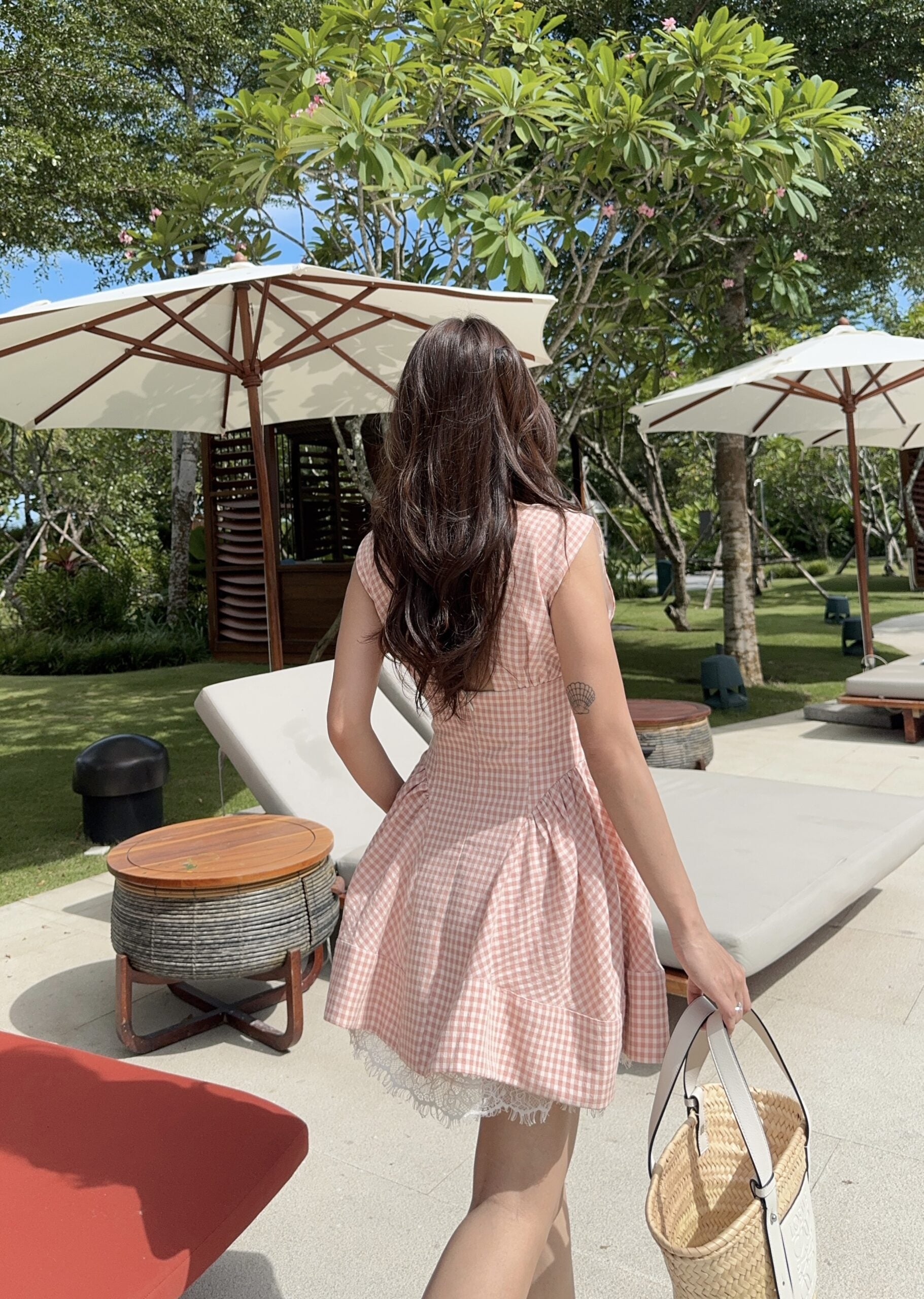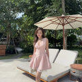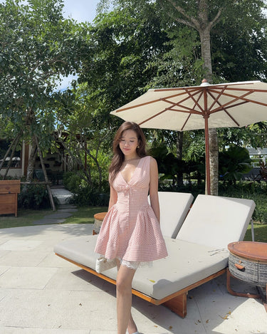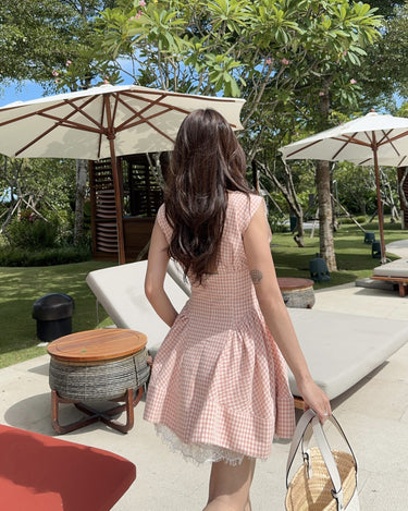 The Sadie Dress in Pink-Orange Gingham is a playful mini dress with charming vintage details. Designed to flatter your figure with a cinched waist and flared skirt, it features delicate lace trim and a statement bow neckline — perfect for brunches, picnics, or sunny strolls.