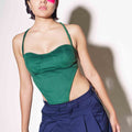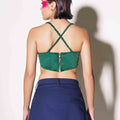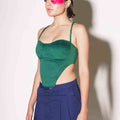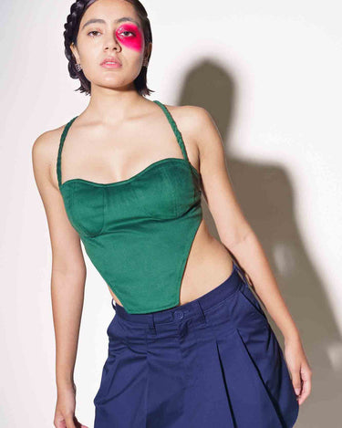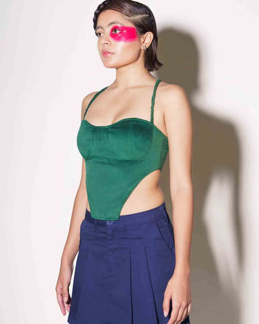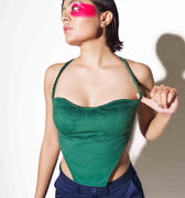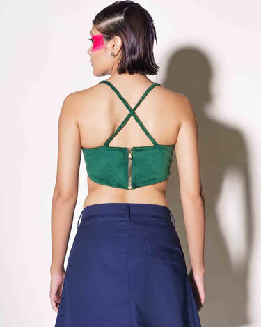 Corset top with braided straps that crosses over at back. Elevate your style with our stunning green corset top. The vibrant green hue adds a refreshing and captivating touch to any outfit. This corset top features unique braided straps that beautifully cross over at the back, adding a touch of intricacy and elegance. The corset design accentuates your curves, creating a flattering silhouette.