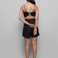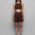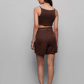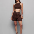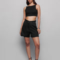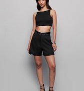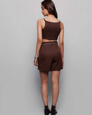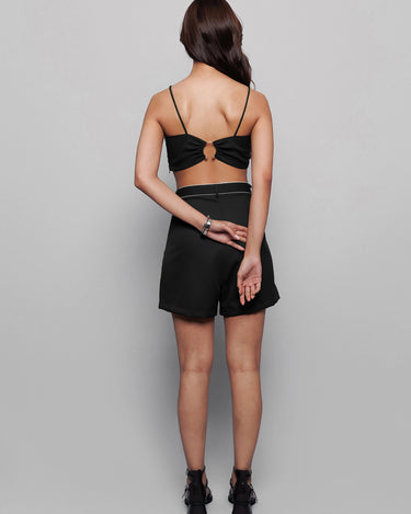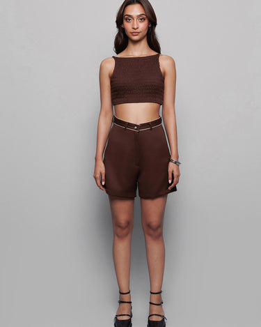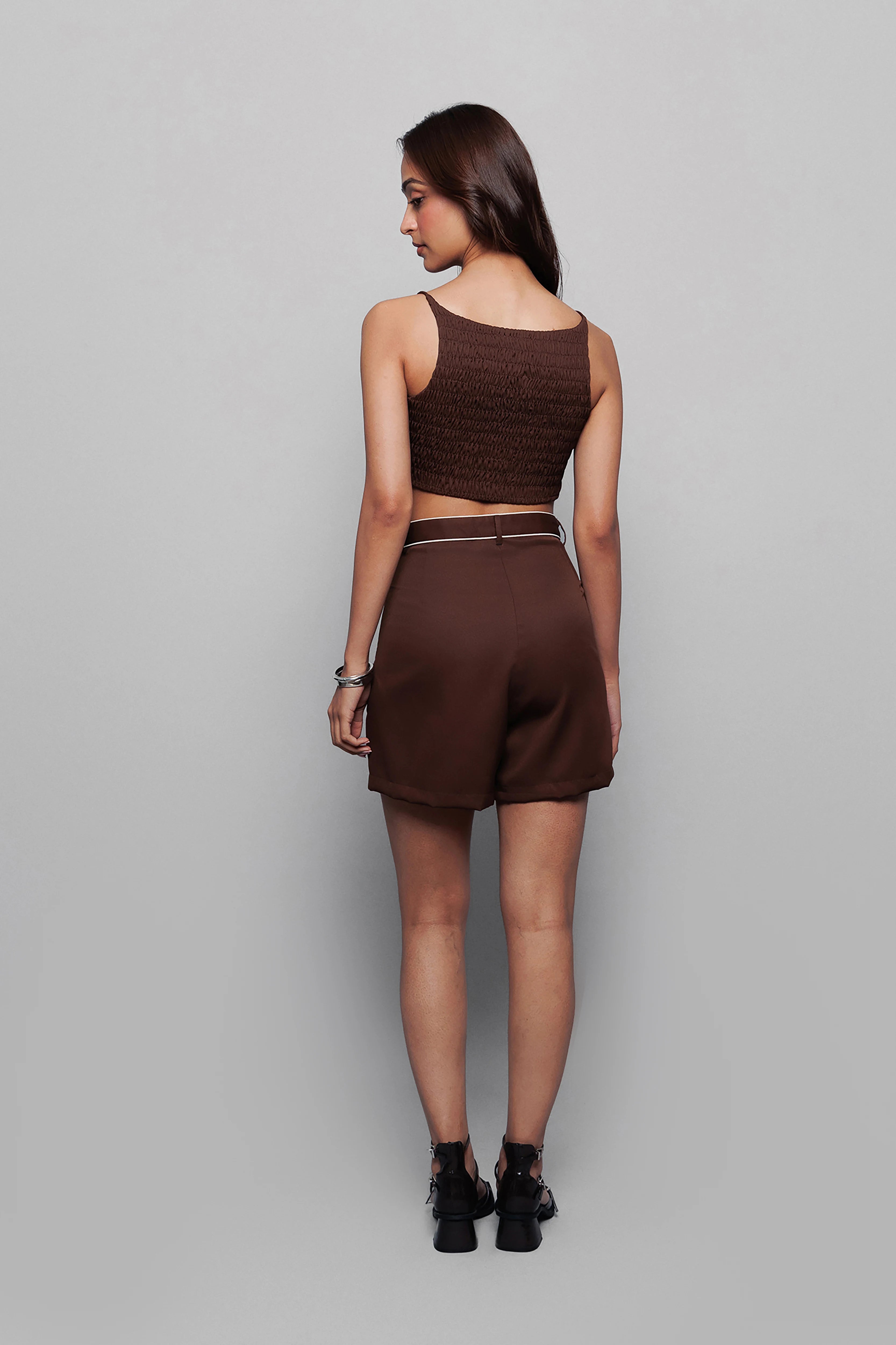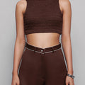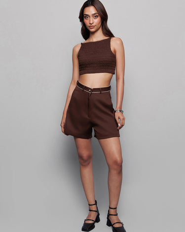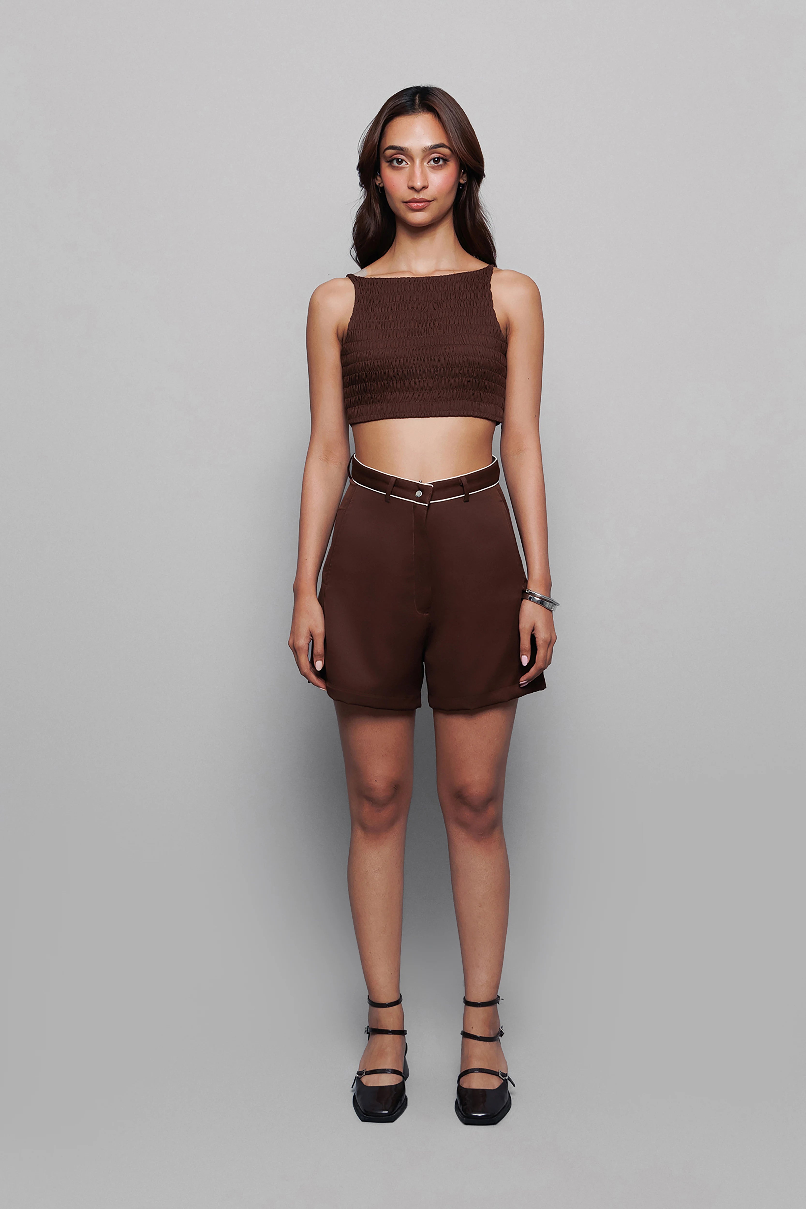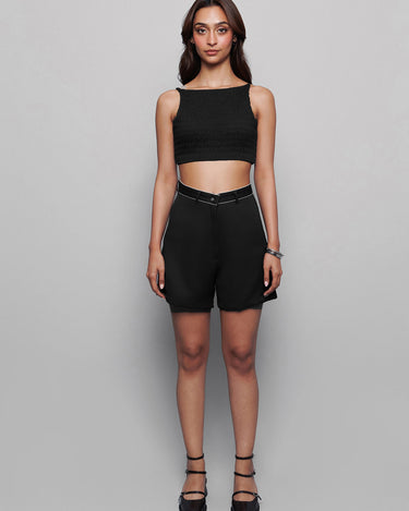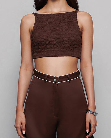 This crop top features front smocking and a circular accessory detail at the back. Its unique design adds a chic, structured look.