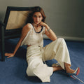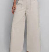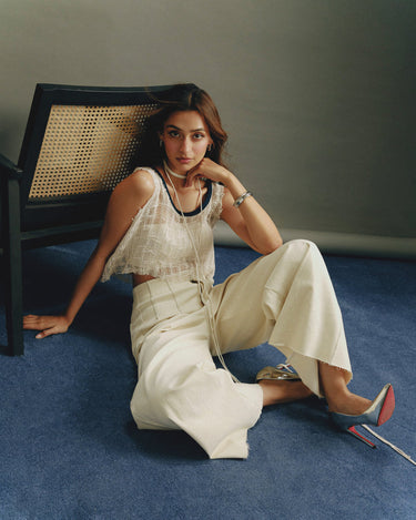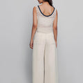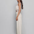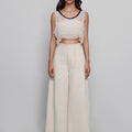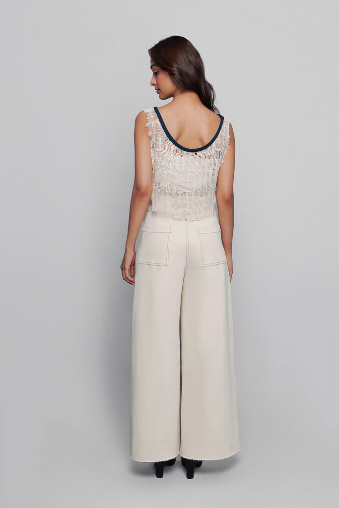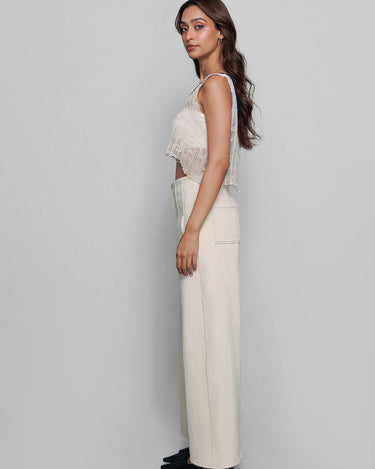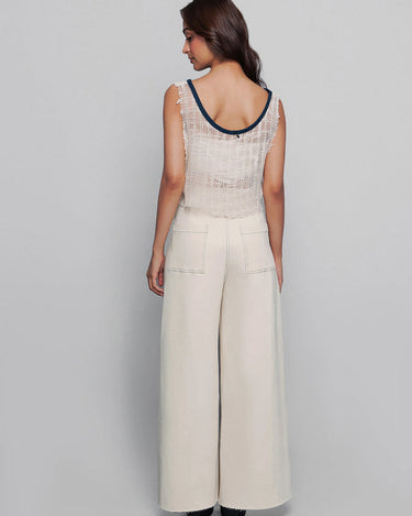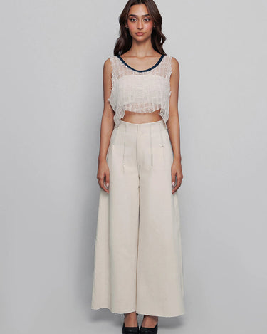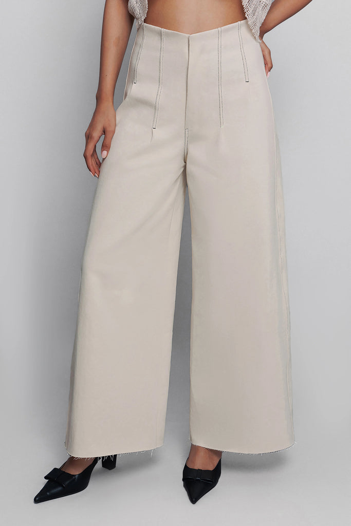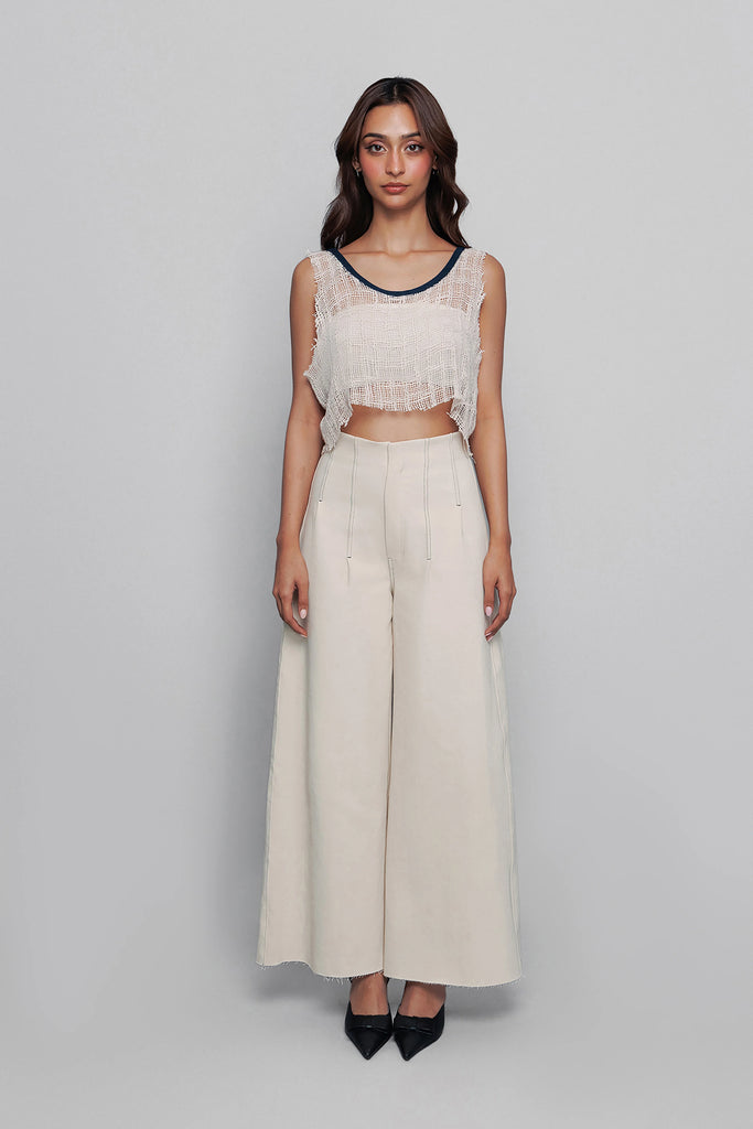 These white pants have a flowy structure and subtle detailing. Their relaxed fit makes them perfect for both casual and semi-formal occasions.
