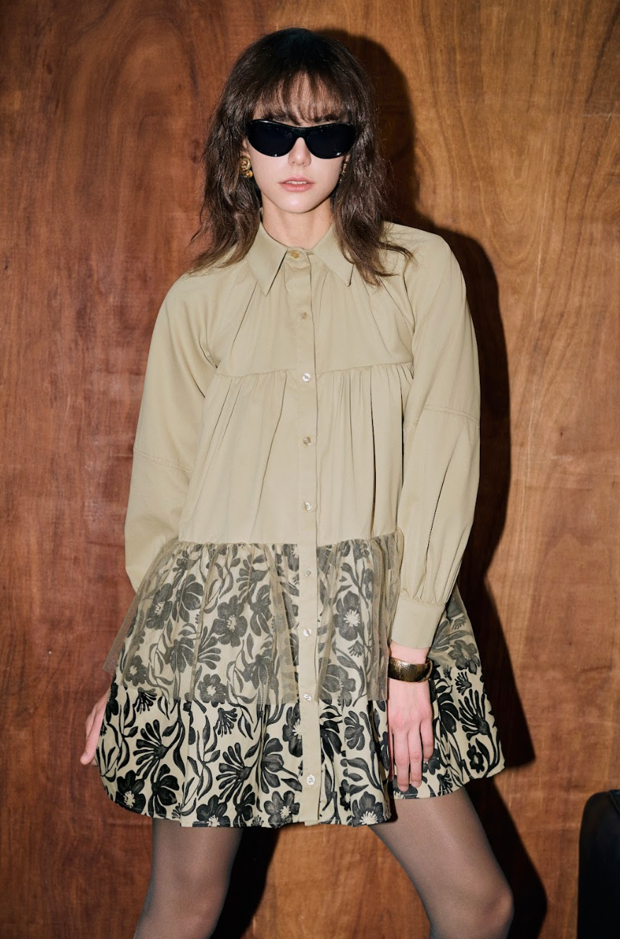 Floral Mesh Babydoll Shirt Dress - Khaki