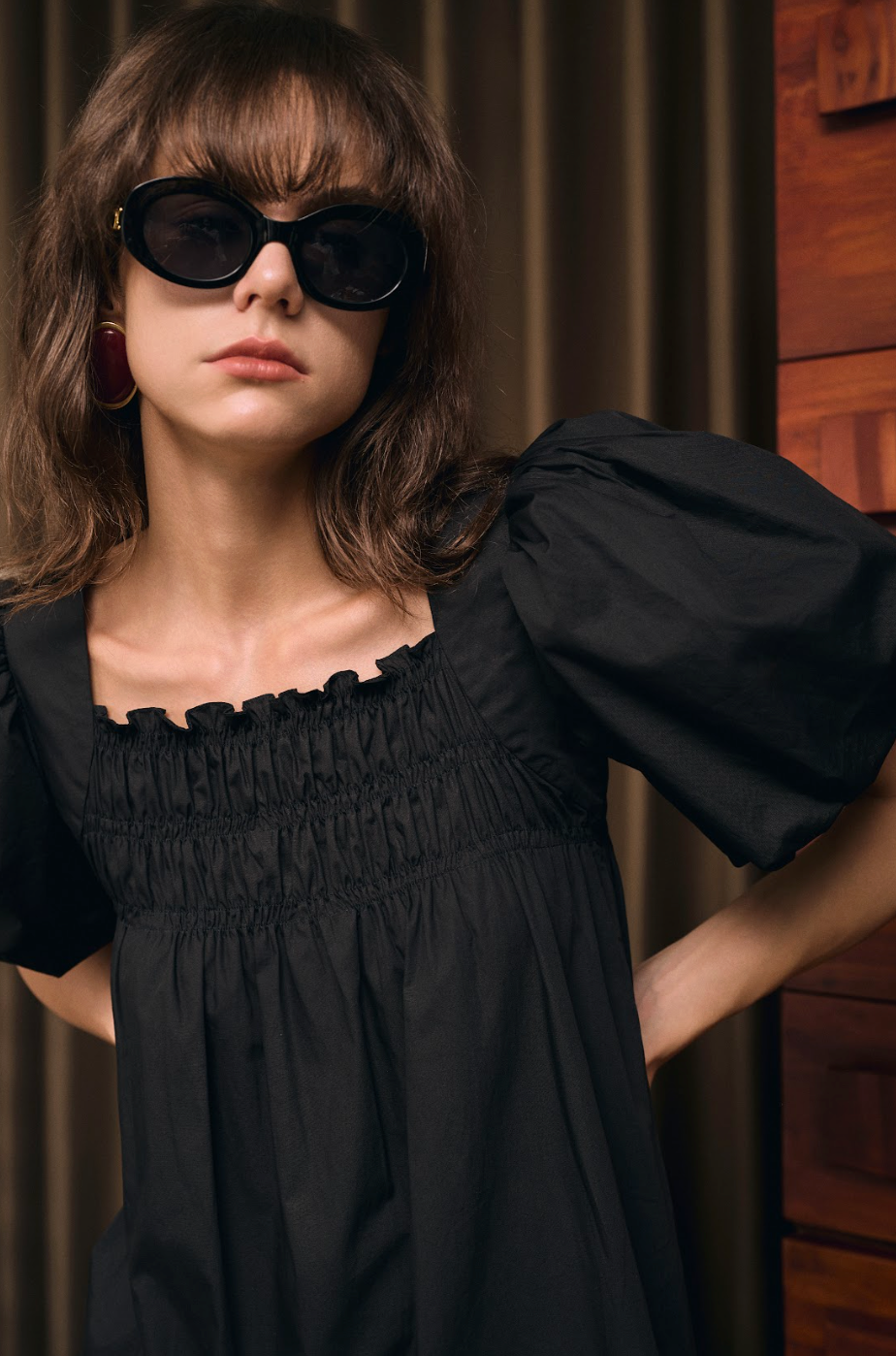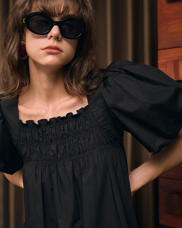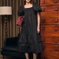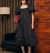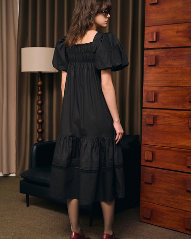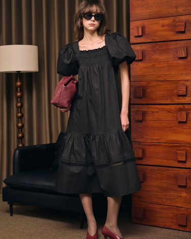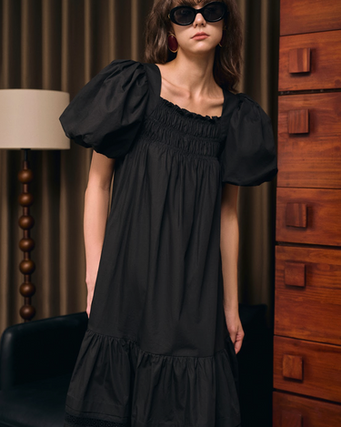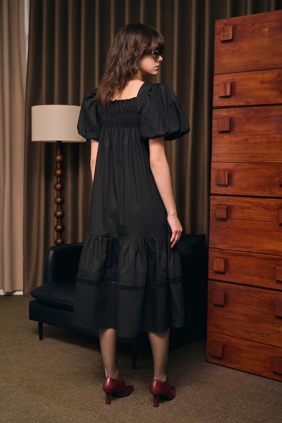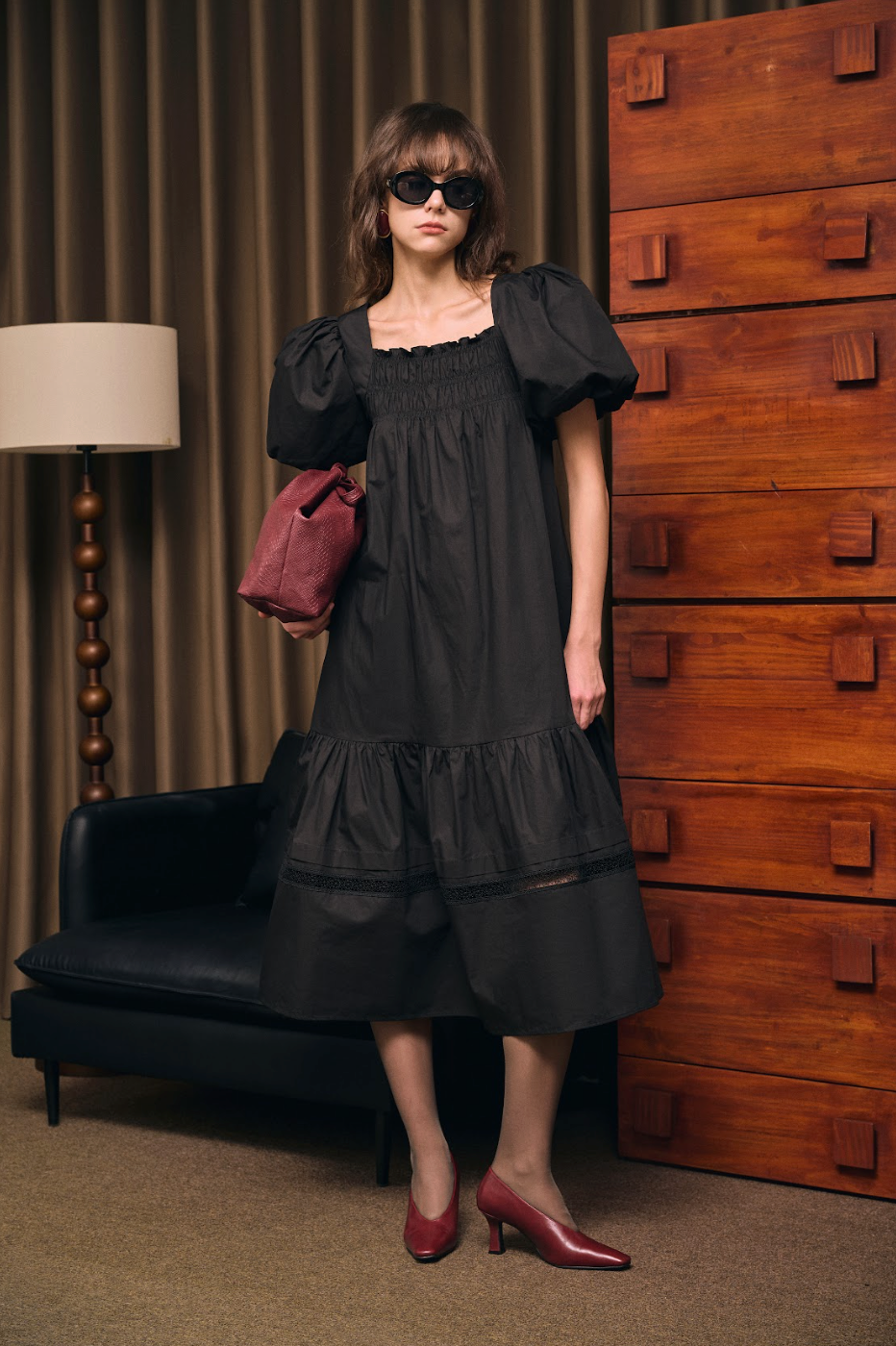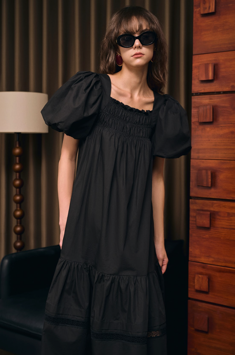 Cut in RANDOMLIST’s signature babydoll silhouette, this midi dress is crafted from a structured cotton blend that holds its form with ease. The smocked bodice offers a flexible fit, while the skirt flows softly with lace trim - subtle yet captivating in its detail.