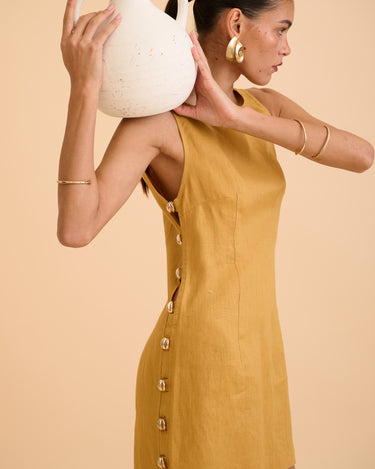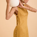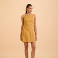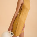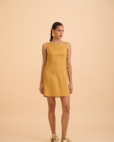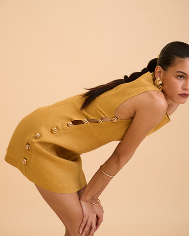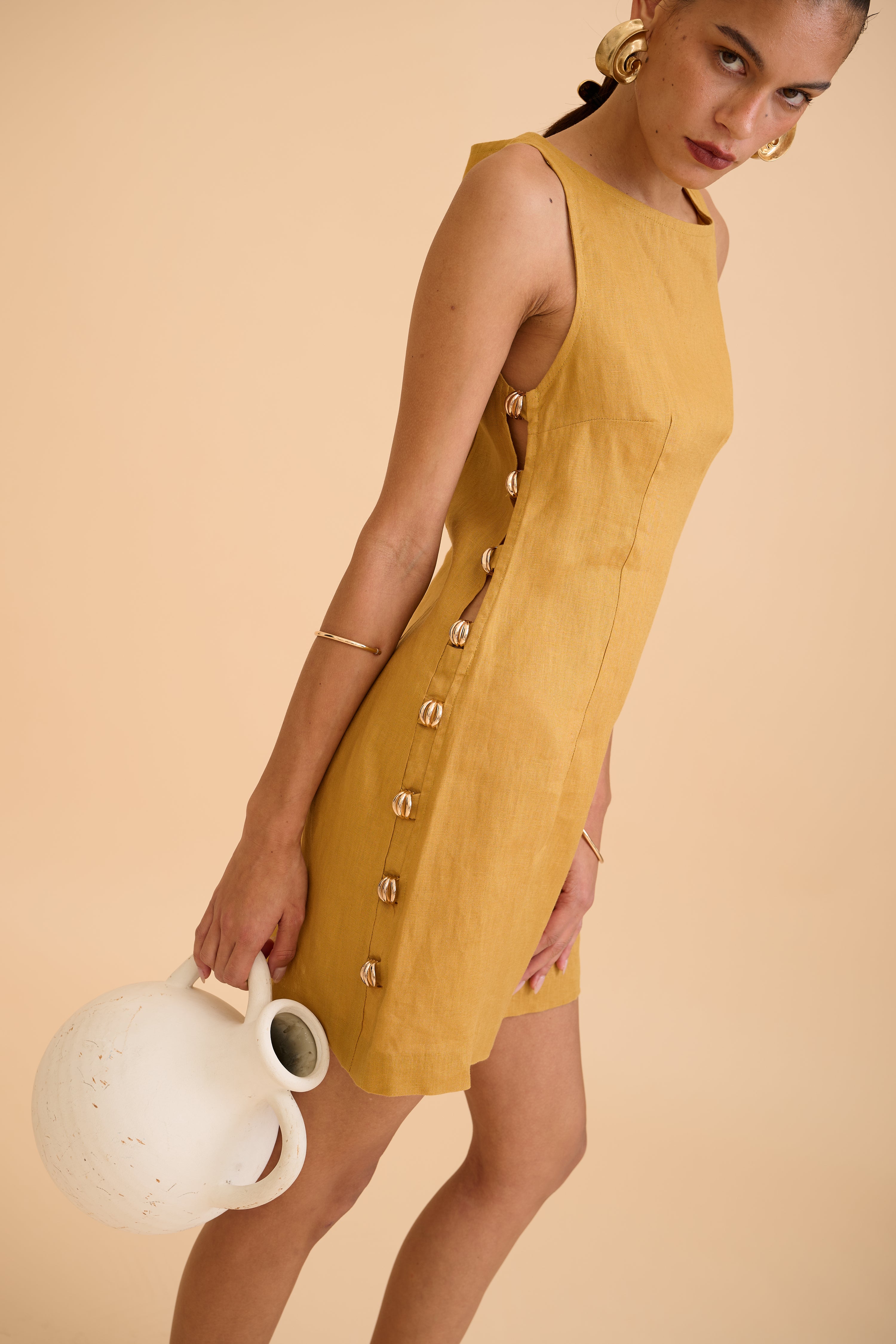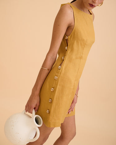 Effortless sophistication with a subtle glow. The Salomi Cut-Out Mini Dress features tasteful cut-outs that add a modern edge, accented by delicate gold hardware for a whisper of luxe detail. The lightweight fabric and streamlined silhouette create a look that’s both fresh and timeless—ideal for warm days and slow evenings alike. Wear it with sandals or heels, and with quiet confidence.