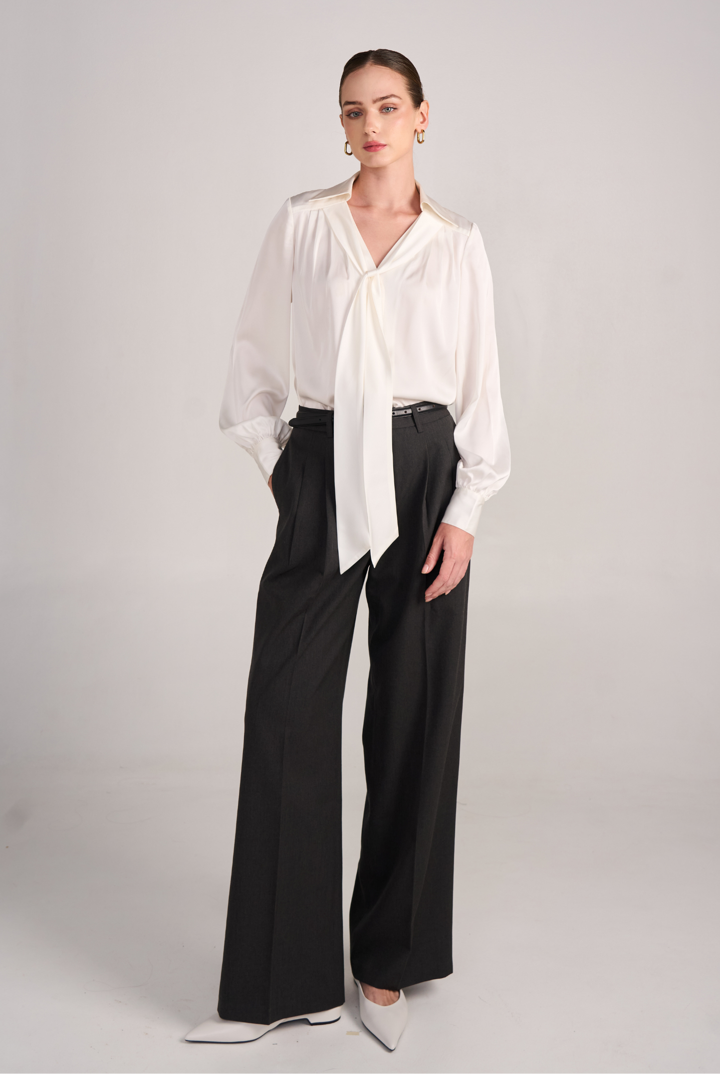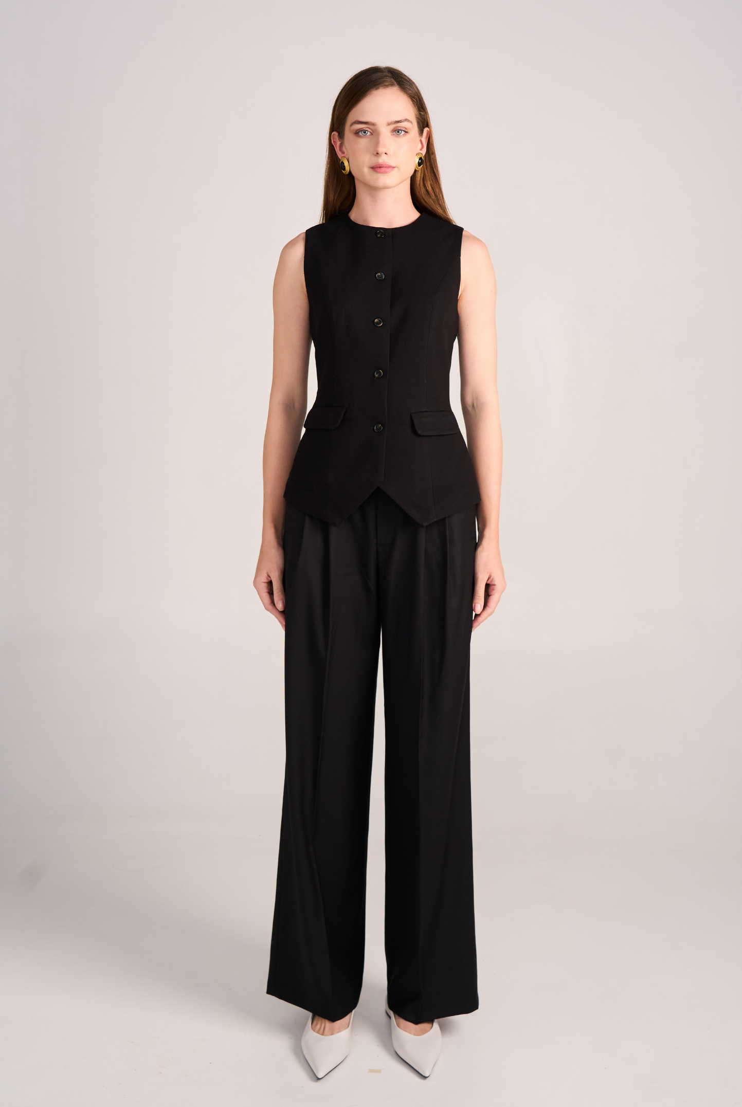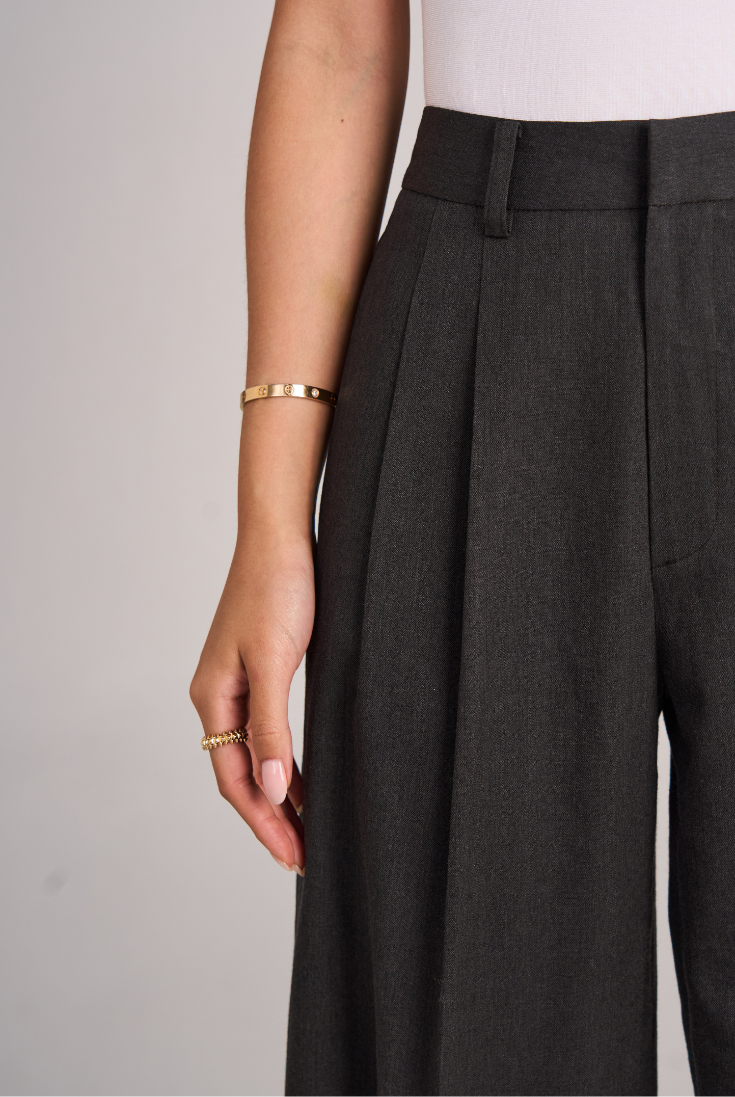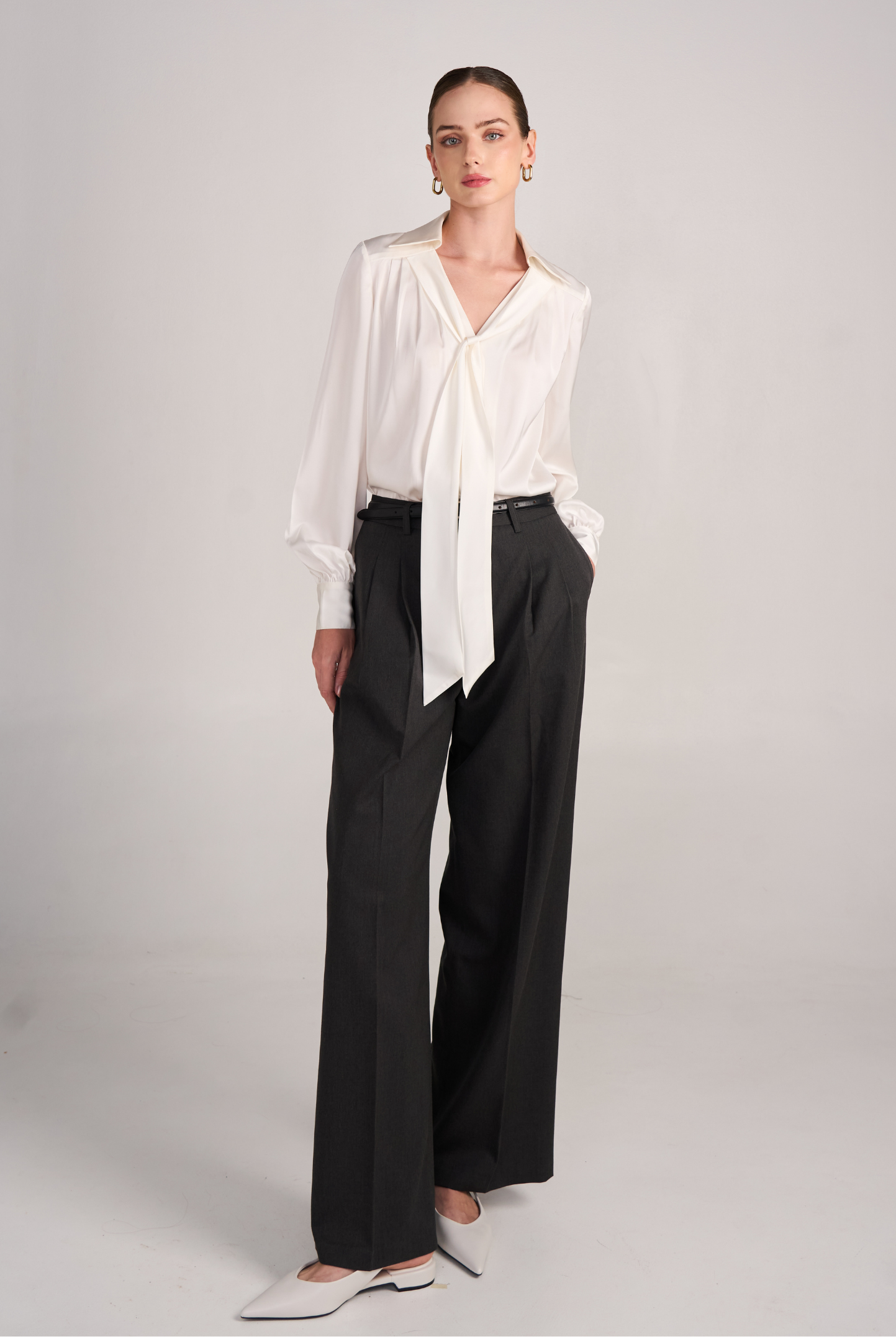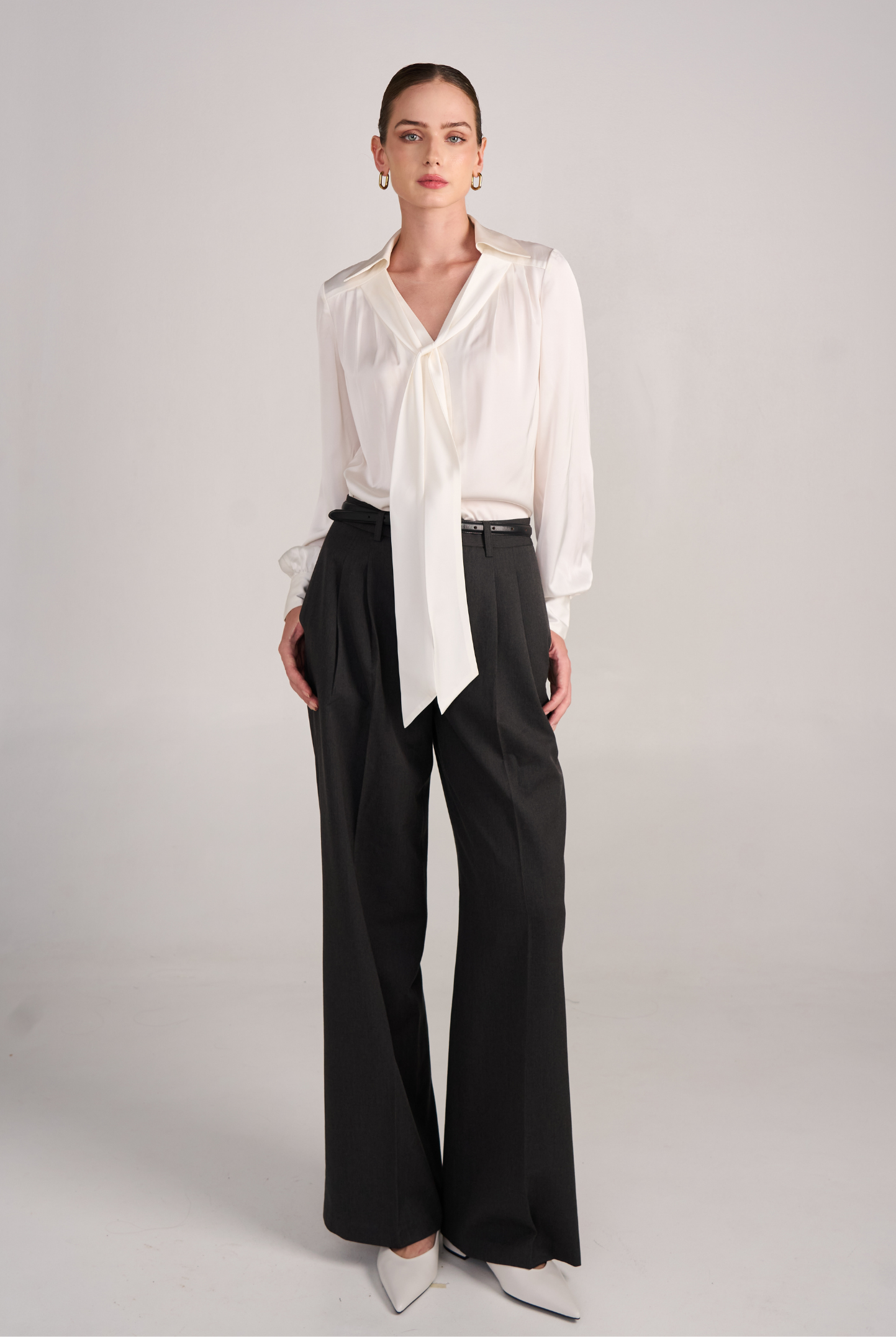 The 02 Essential Pants are a timeless wardrobe foundation — sleek, versatile, and made to flatter. Designed with a high-waisted cut and double darts for a tailored fit, they elongate the legs while offering effortless comfort. The fluid wide-leg silhouette moves gracefully, making them perfect for office wear, evenings out, or everyday sophistication. Available in Black, Ivory, and Grey for endless styling options.