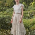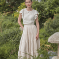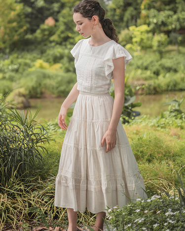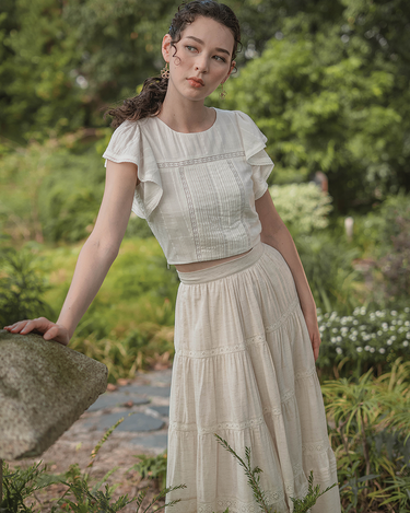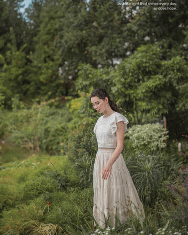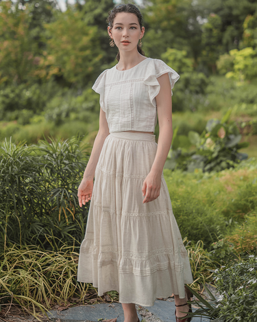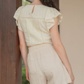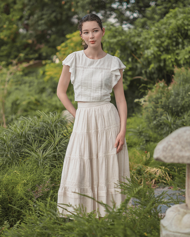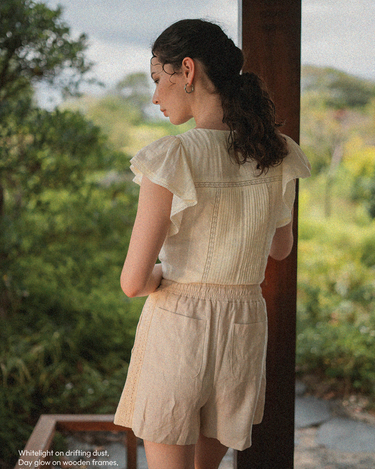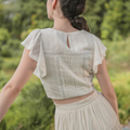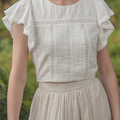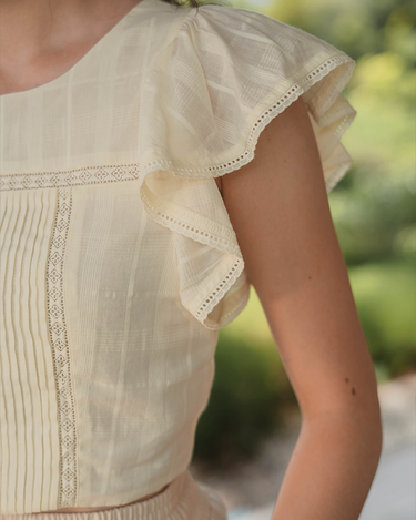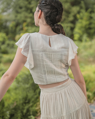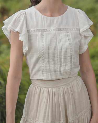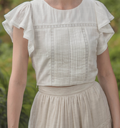 The perfect pairing for all your high-waisted bottoms and skirts. The Shoji Flutter Top features a cropped silhouette with gentle flutter sleeves, complemented by pintuck and trim details along the bodice. Thoughtfully finished with full lining, a side zip opening, and a keyhole button closure at the back. Available in White & Daylight
