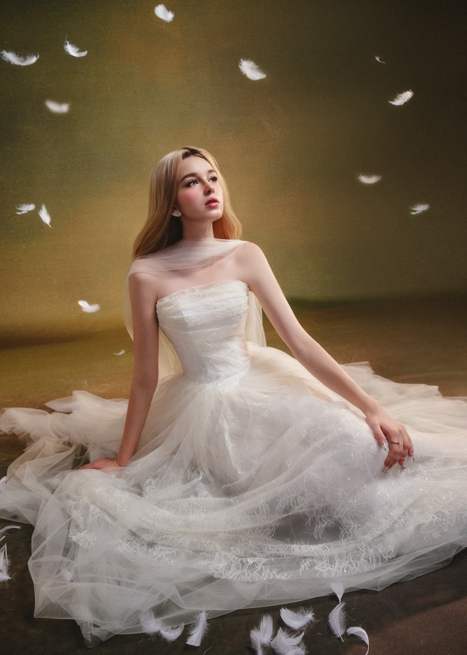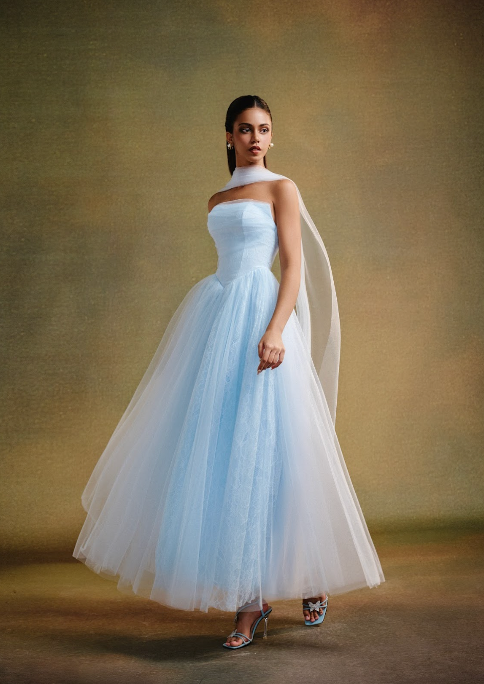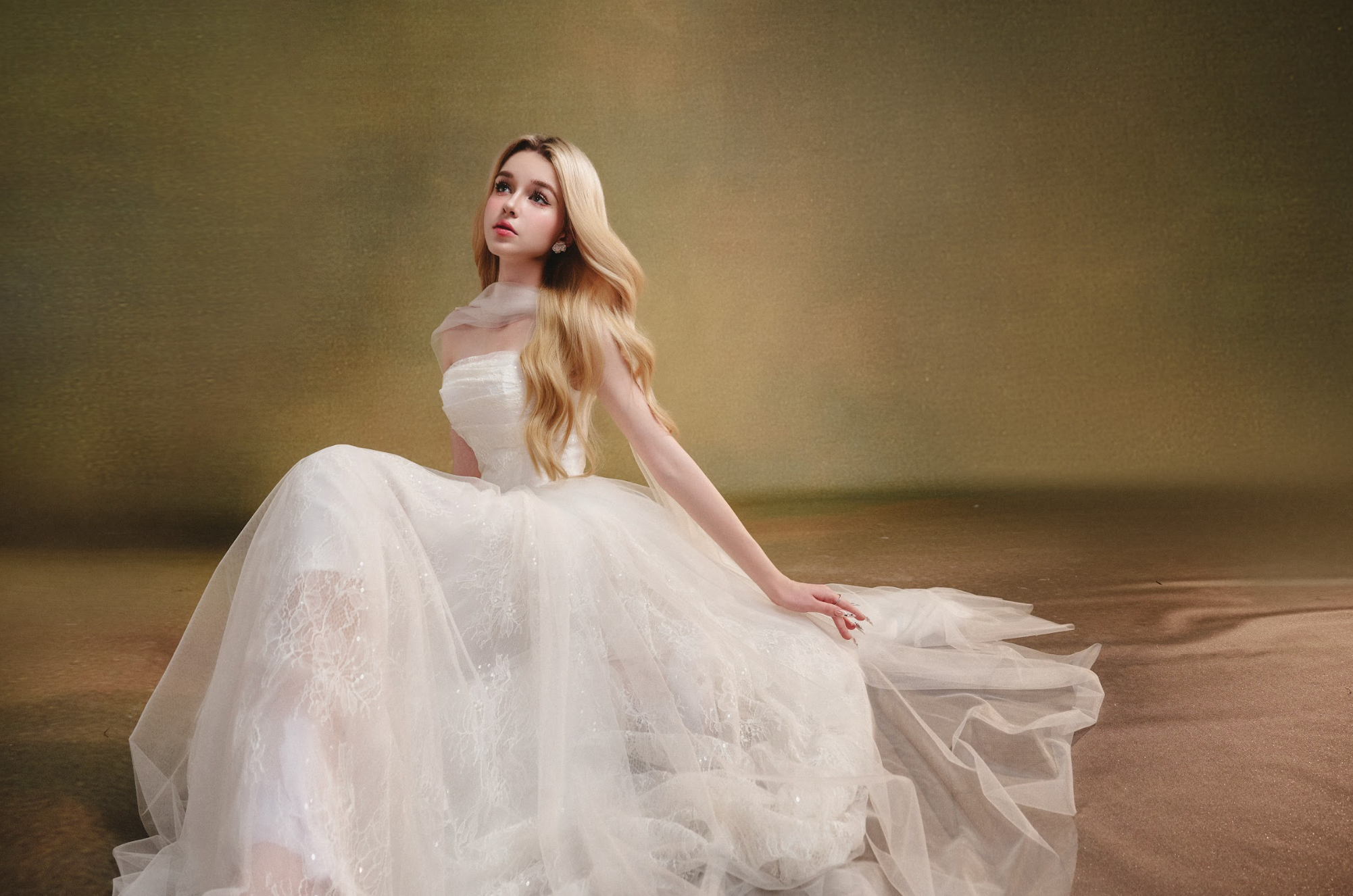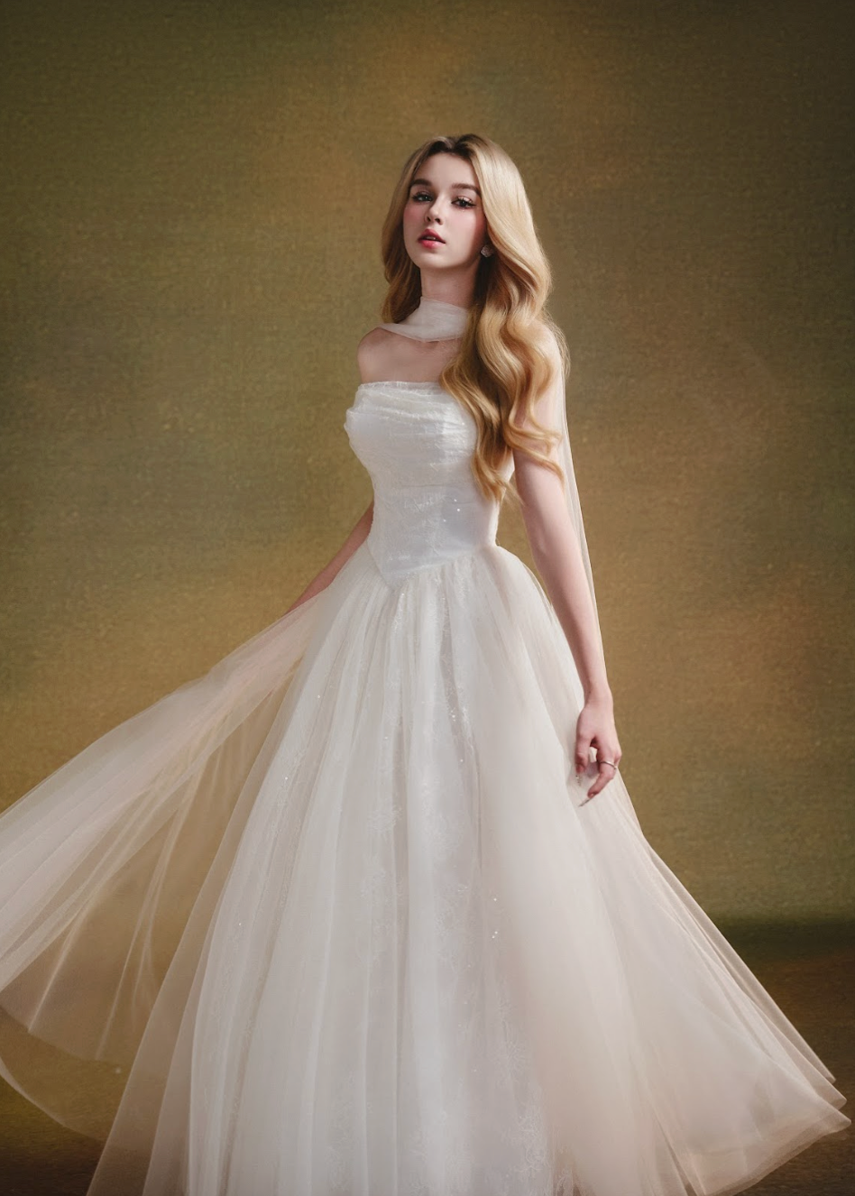 As soft as a feather’s touch, the Amelia Corset Dress captures the purity and grace of a fairytale dream. Crafted from shimmering sequin lace layered with airy tulle, the gown glows softly under the light - like morning dew kissed by sunshine. Its structured corset bodice sculpts the waist, while the detachable sheer tulle scarf drapes gently over the shoulders, adding a touch of ethereal romance.
