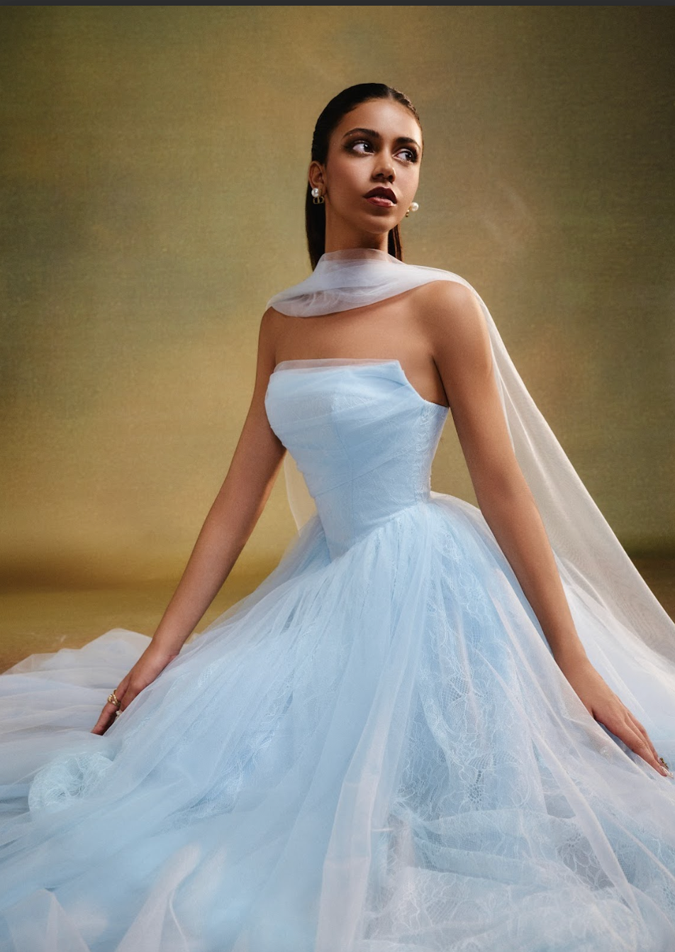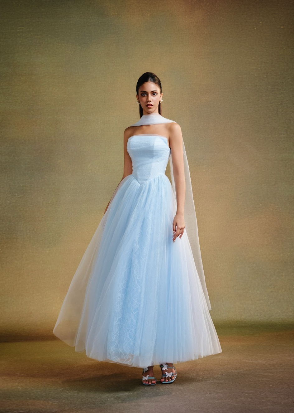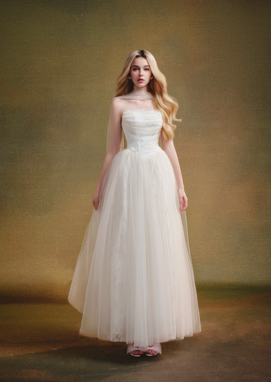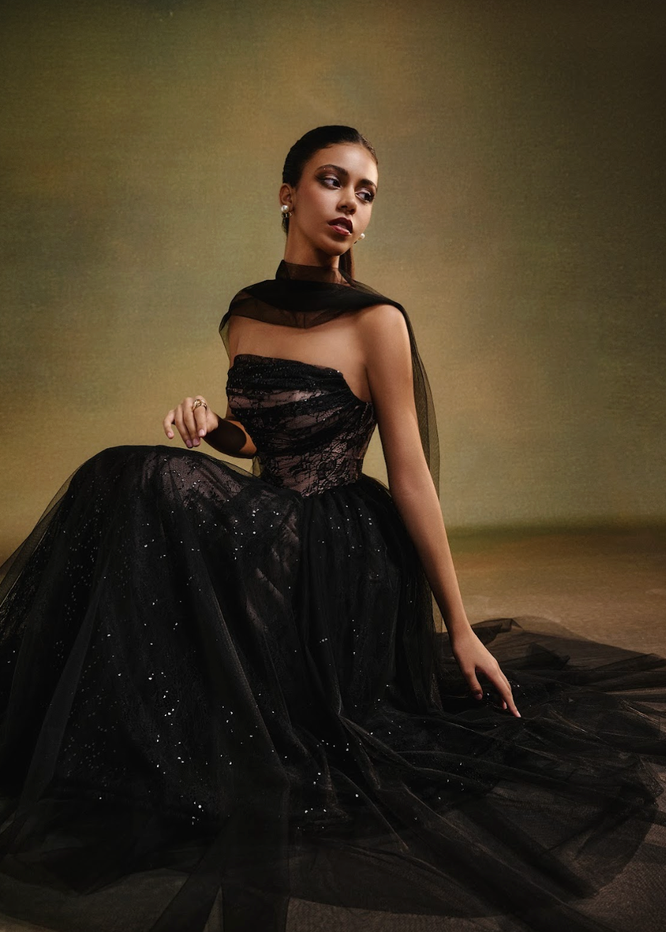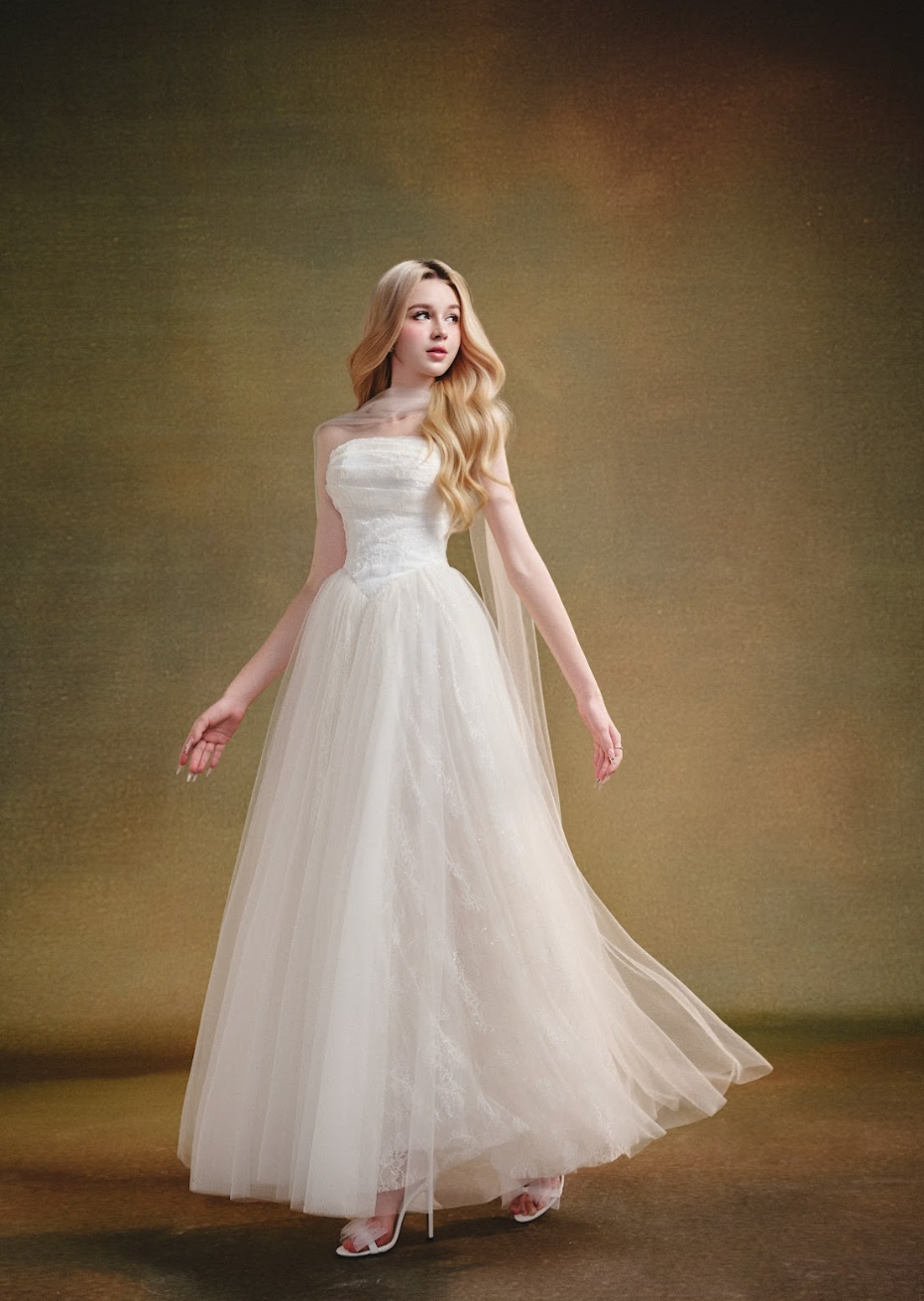 As soft as a feather’s touch, the Amelia Corset Dress captures the purity and grace of a fairytale dream. Crafted from shimmering sequin lace layered with airy tulle, the gown glows softly under the light - like morning dew kissed by sunshine. Its structured corset bodice sculpts the waist, while the detachable sheer tulle scarf drapes gently over the shoulders, adding a touch of ethereal romance.