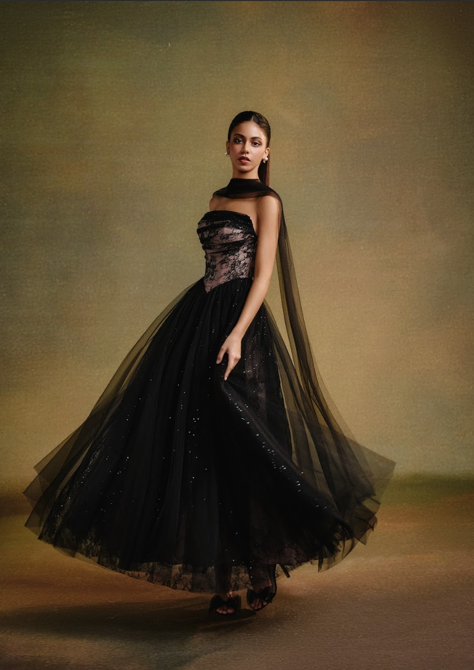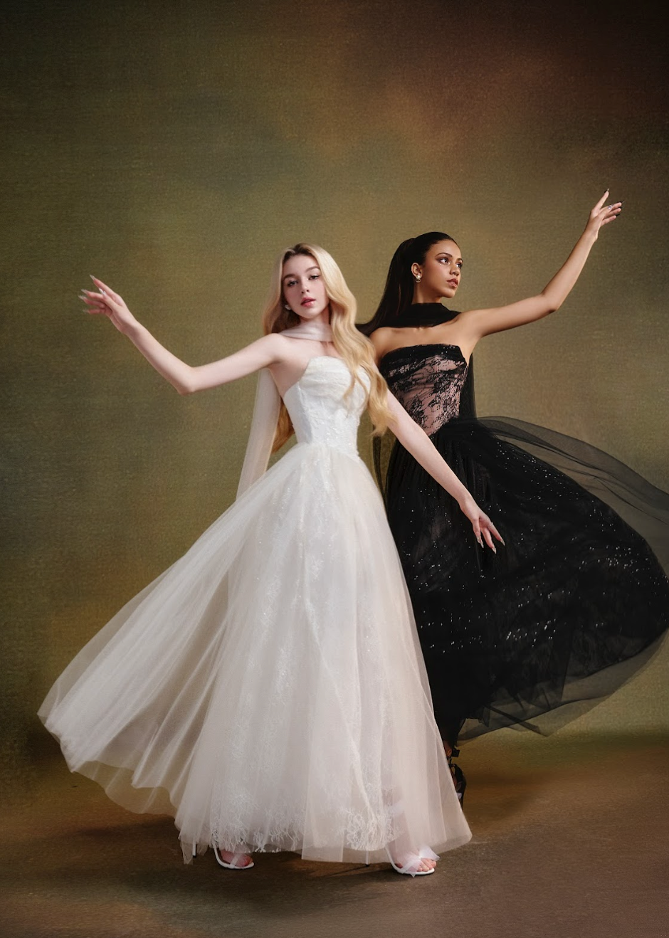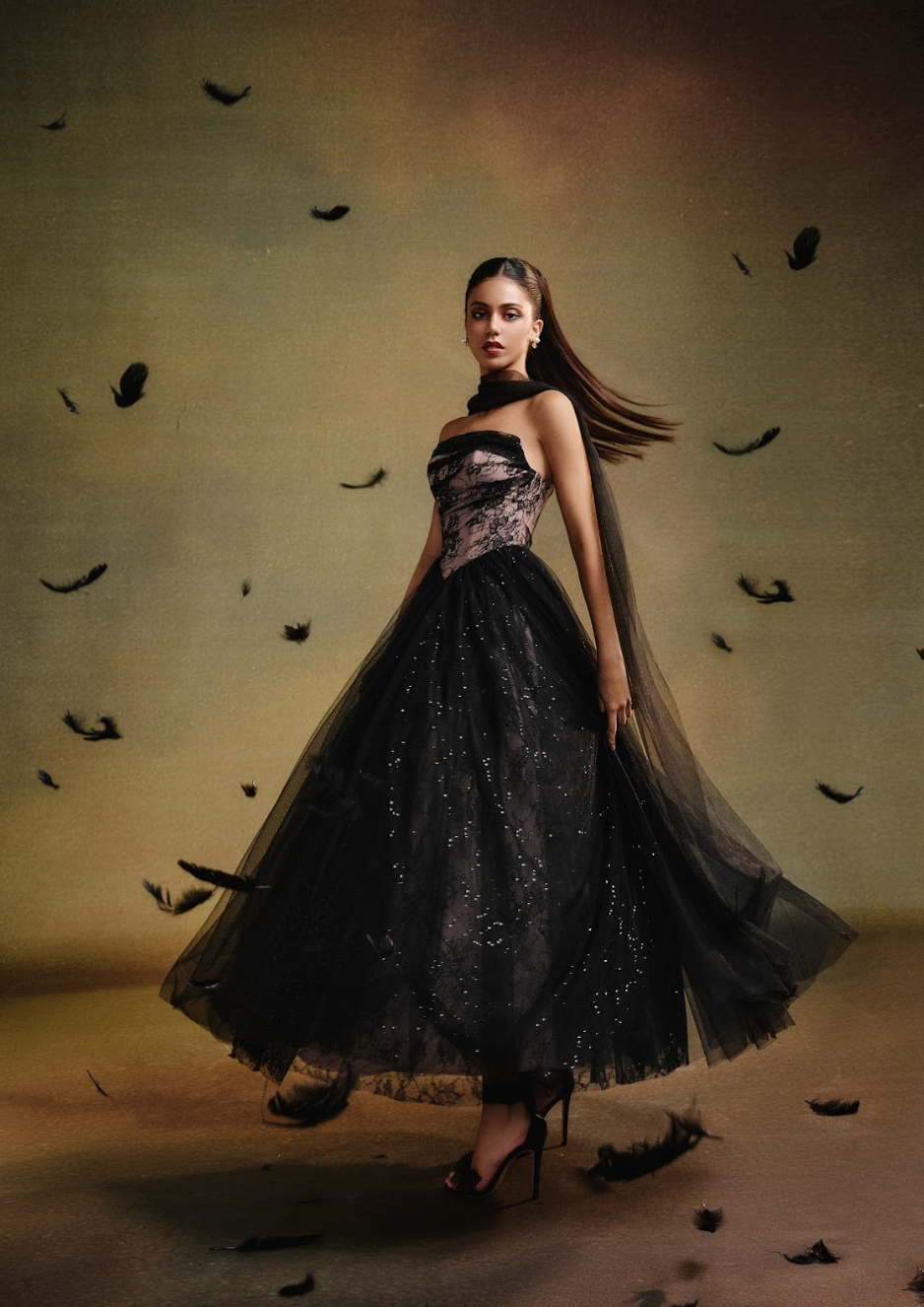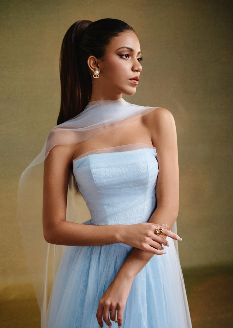 As soft as a feather’s touch, the Amelia Corset Dress captures the purity and grace of a fairytale dream. Crafted from shimmering sequin lace layered with airy tulle, the gown glows softly under the light - like morning dew kissed by sunshine. Its structured corset bodice sculpts the waist, while the detachable sheer tulle scarf drapes gently over the shoulders, adding a touch of ethereal romance.