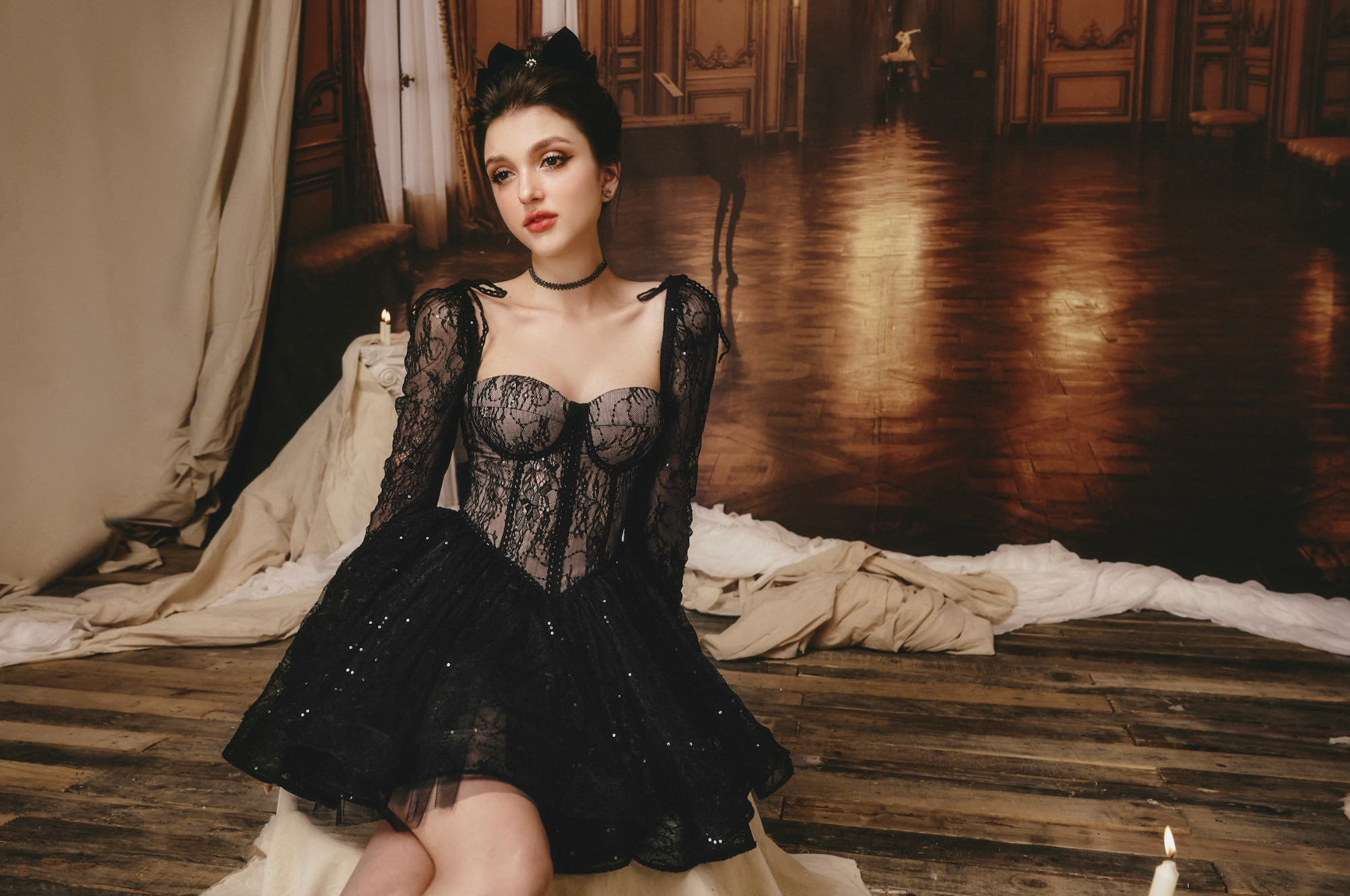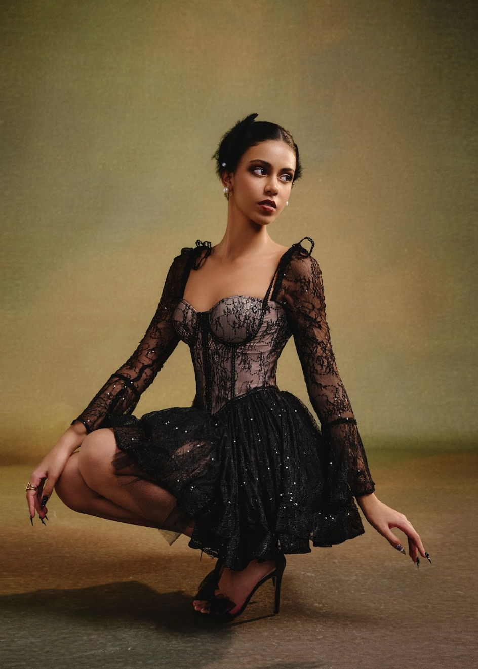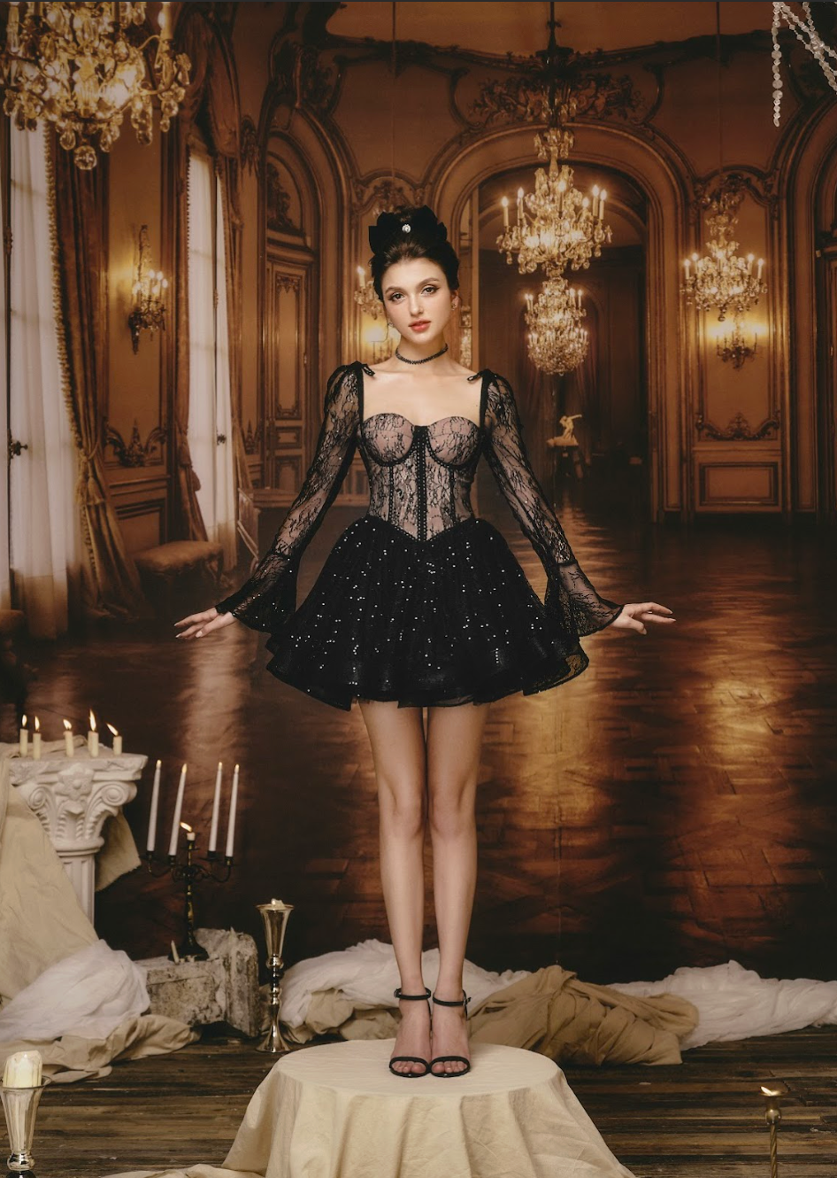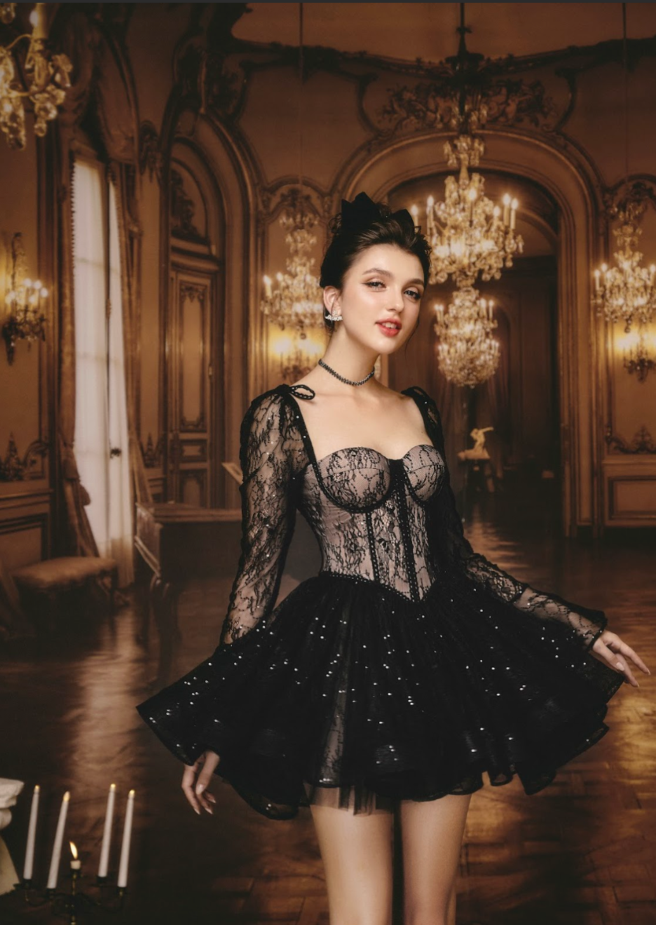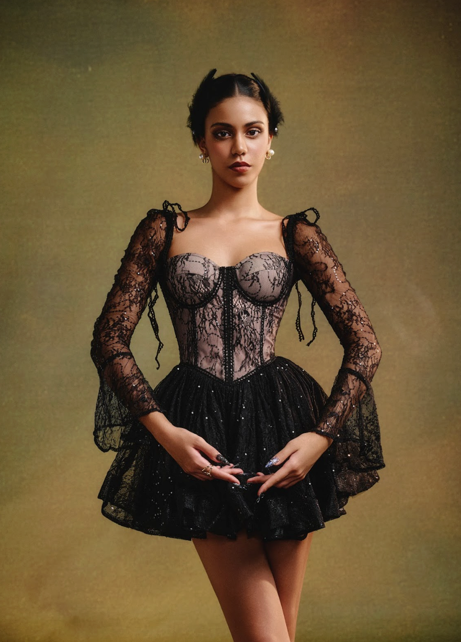 A stunning black creation that wraps the body in timeless elegance. The corset-style bodice embraces the bust with a secure, form-fitting design, offering both structure and support. The delicate black lace overlay exudes mystery, while the soft cream lining ensures comfort. Subtle sequins catch the light, adding a touch of glamour.