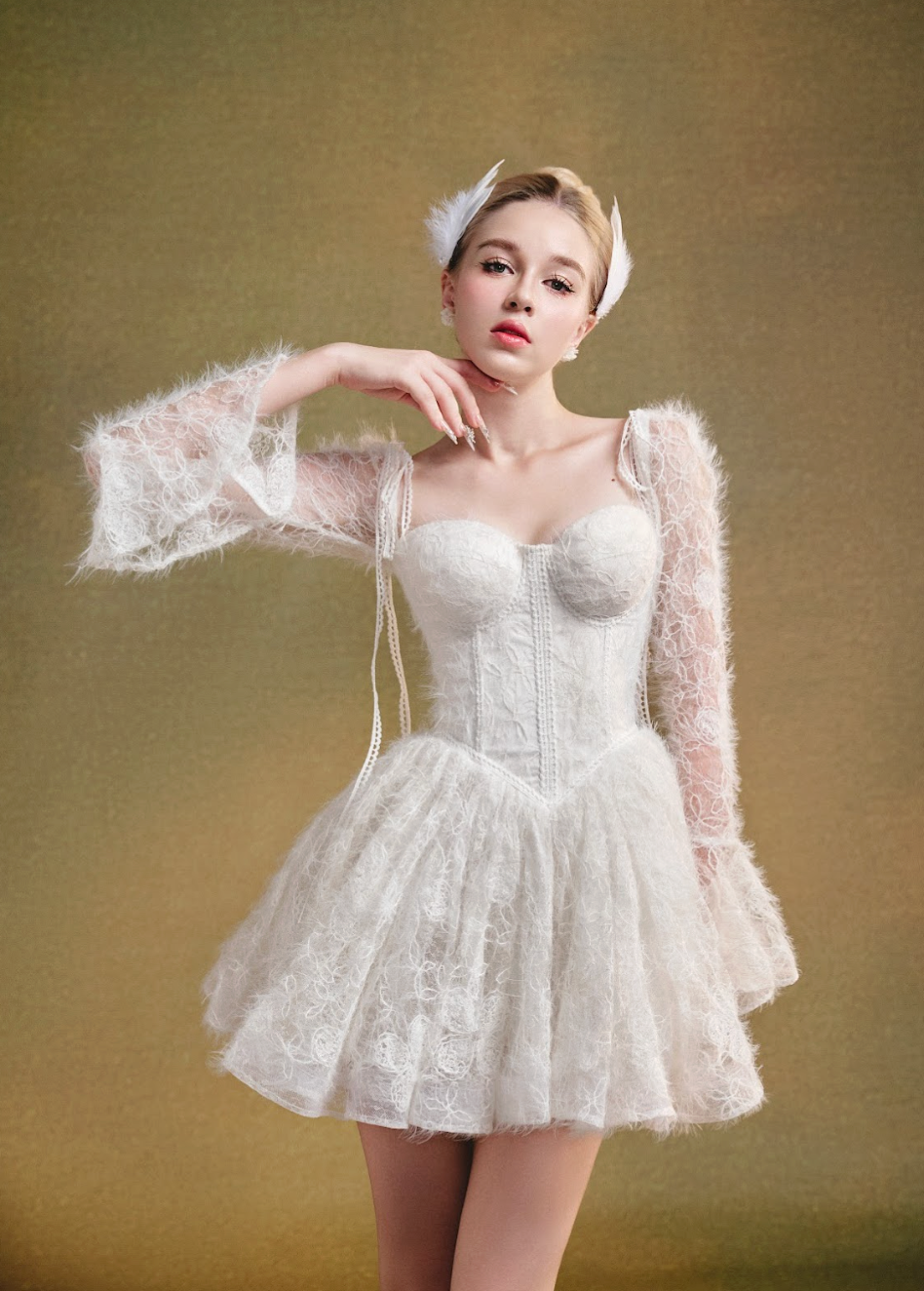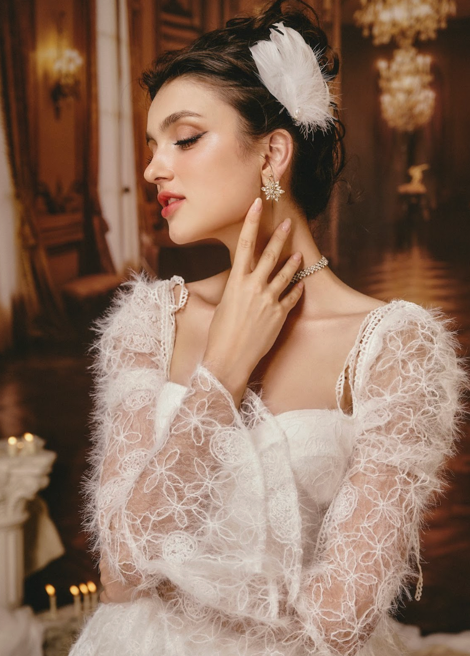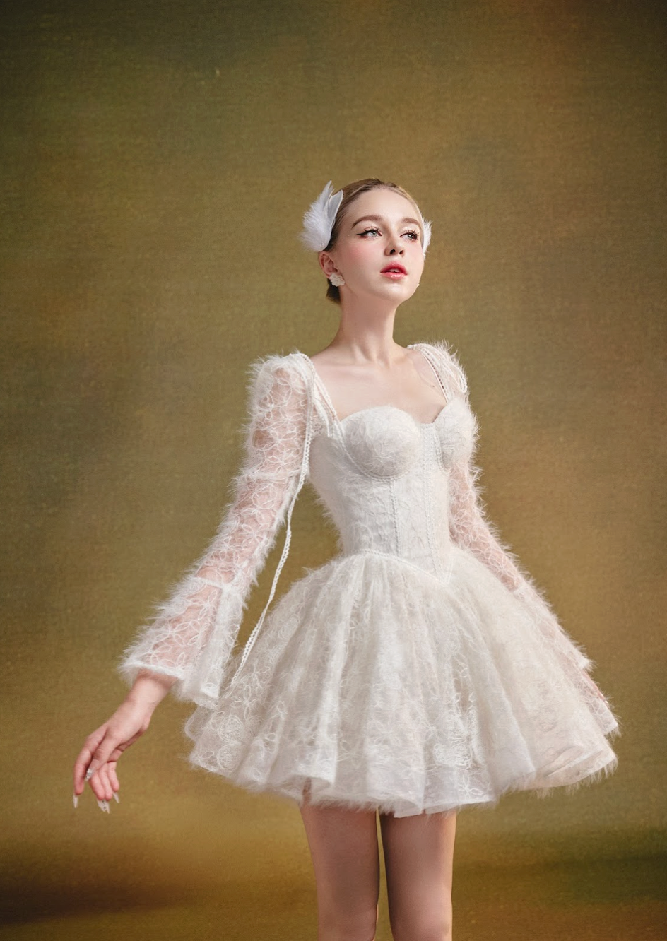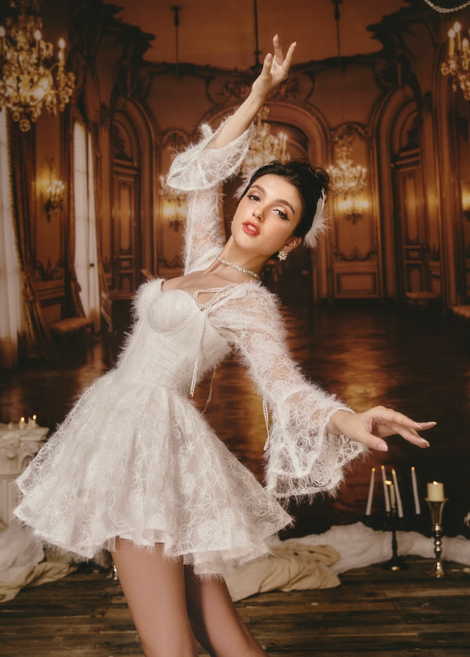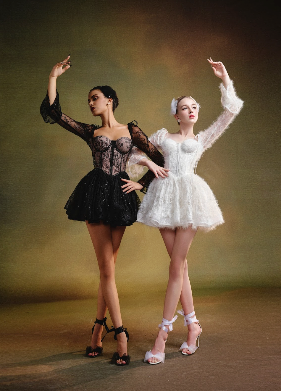 A stunning black creation that wraps the body in timeless elegance. The corset-style bodice embraces the bust with a secure, form-fitting design, offering both structure and support. The delicate black lace overlay exudes mystery, while the soft cream lining ensures comfort. Subtle sequins catch the light, adding a touch of glamour.