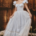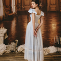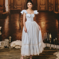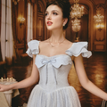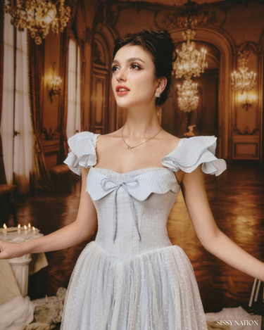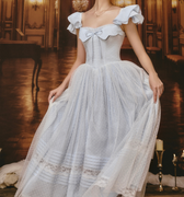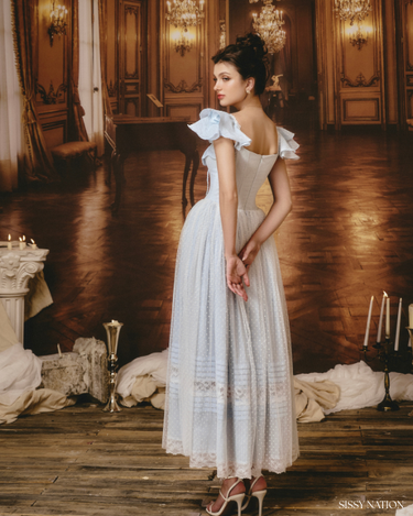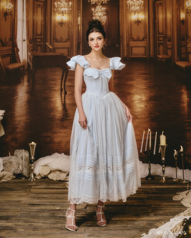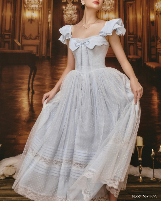 This charming baby blue midi dress features three inner layers with a delicate polka dot tulle overlay. The skirt is beautifully accented with lace trim, while the ruffled neckline and a petite bow add a touch of sweetness.