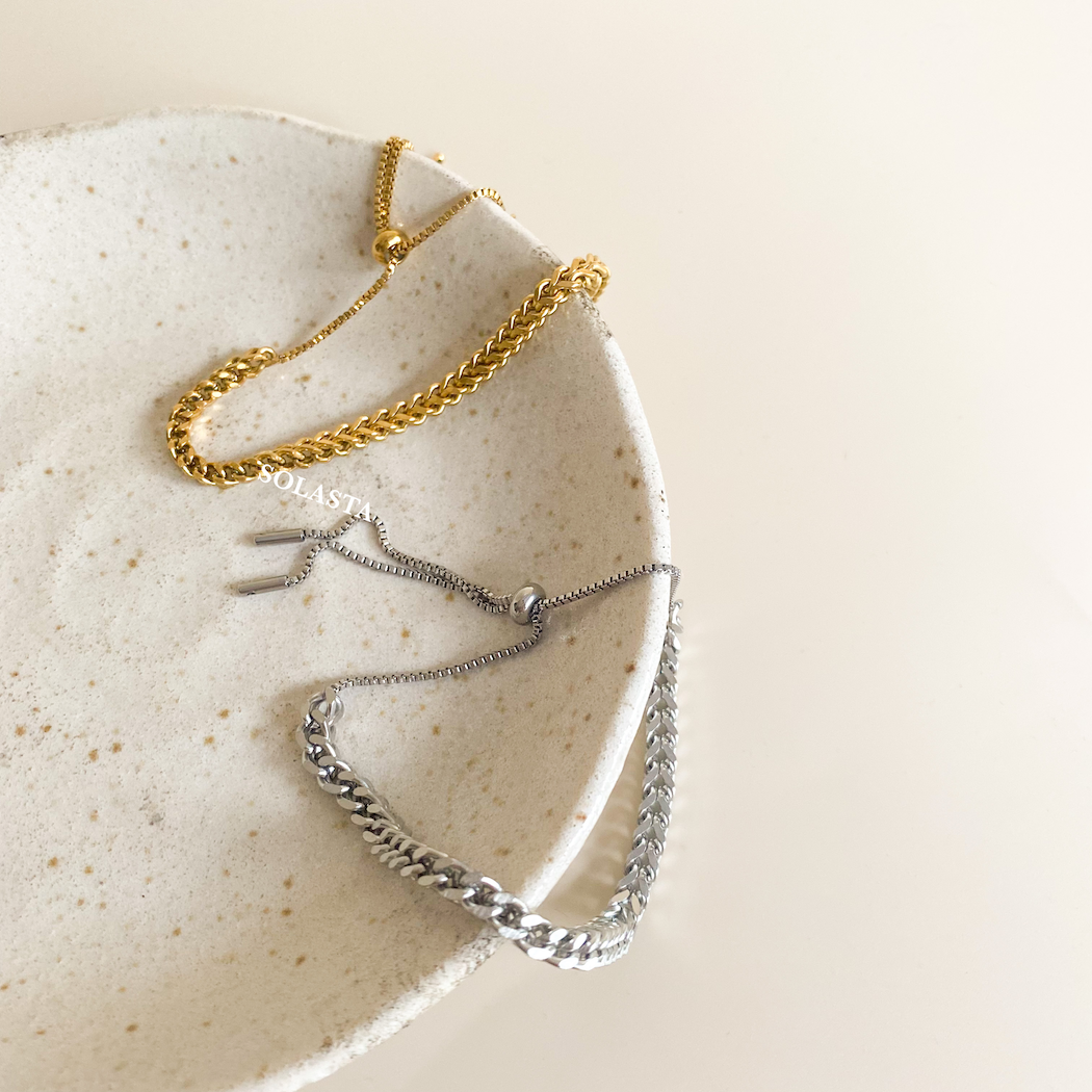 Solasta jewellery is made out of STAINLESS STEEL and STERLING SILVER, PLATED in gold (gold-plated). Jewellery that is not made out of SOLID GOLD has the tendency to oxidise (fade) over time.