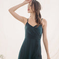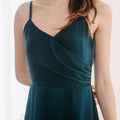 - Ruched bust and overlap skirt details