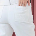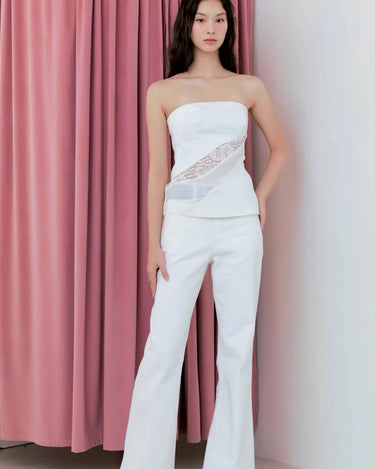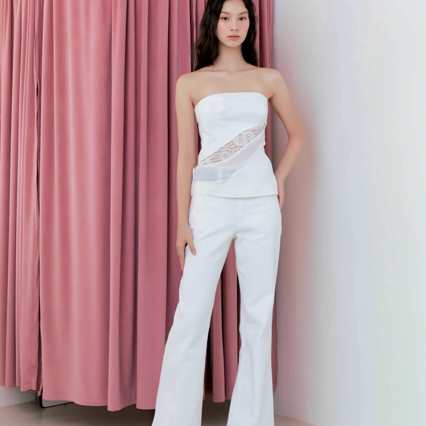 Jeans with mini flare shape. Accented with a silver button and zipper closure. Back pocket lined with lace detailing.