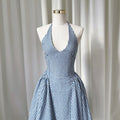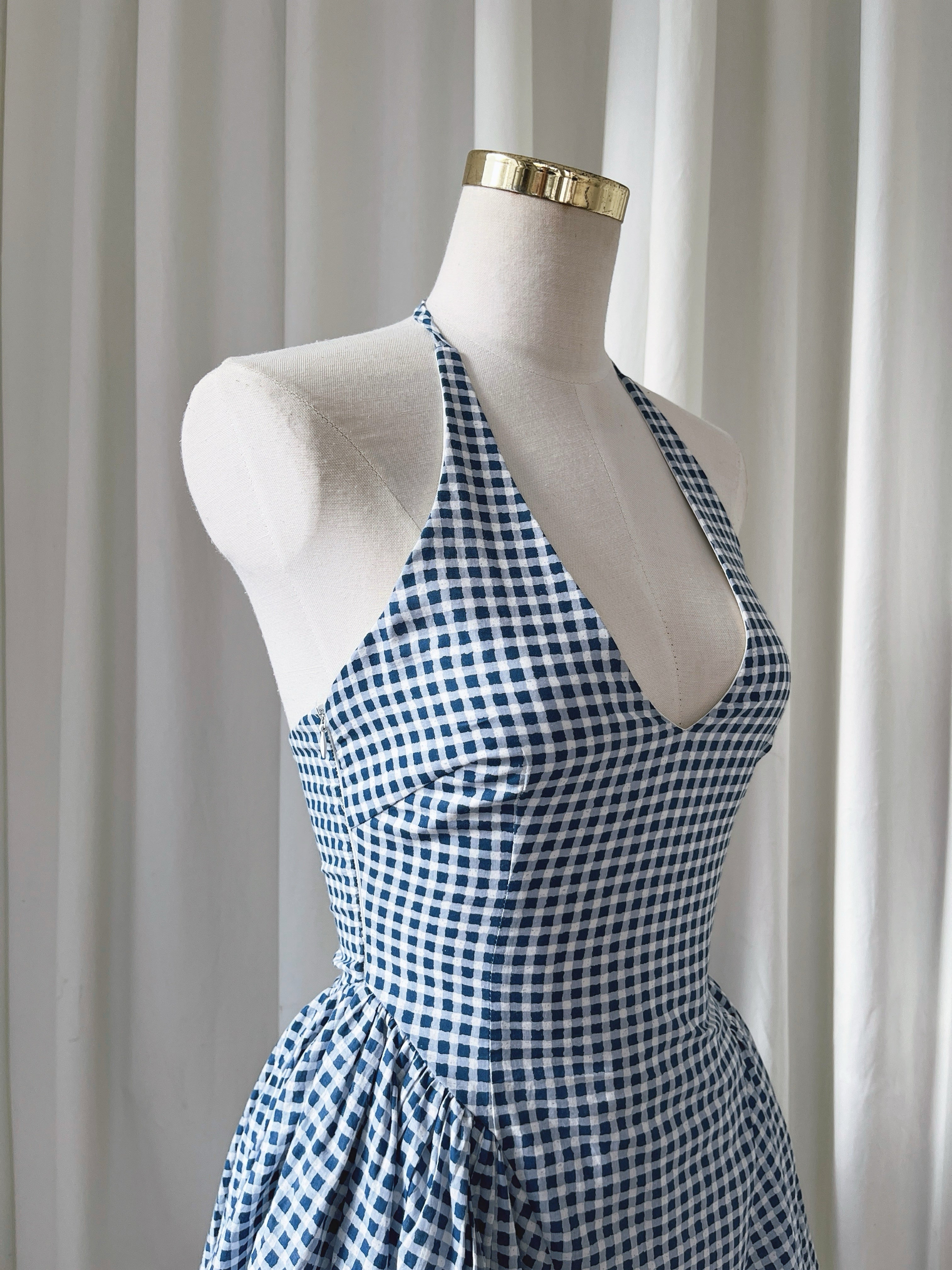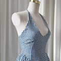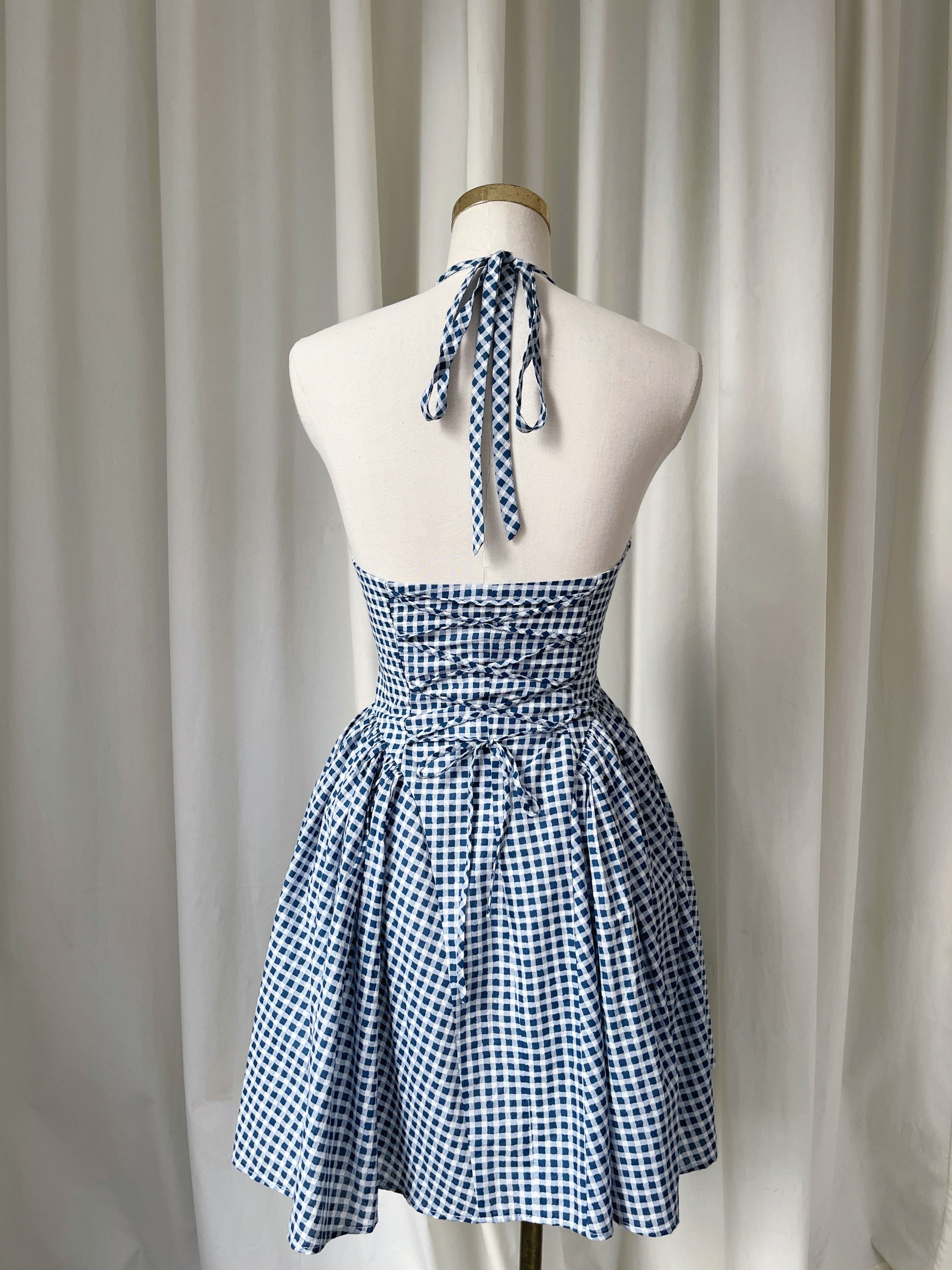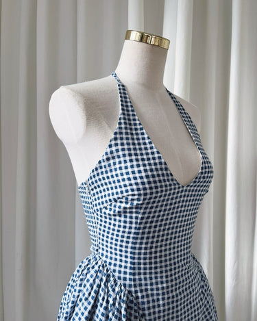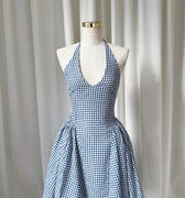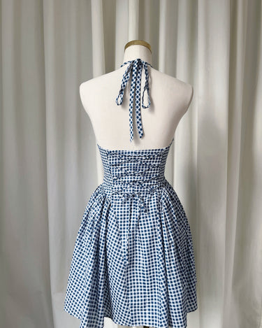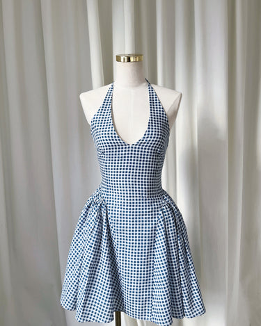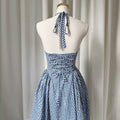 The Evie Dress in tiny blue gingham is a sweet and youthful mini dress perfect for summer days. Made from soft cotton blend fabric with excellent breathability, this dress features a halter neckline with a charming bow at the back and a voluminous gathered skirt. Effortless yet feminine, it is ideal for picnics, casual outings, or seaside vacations.