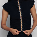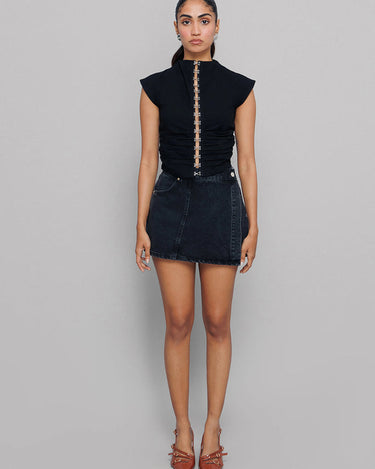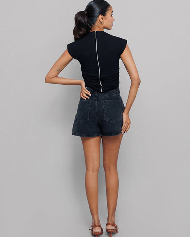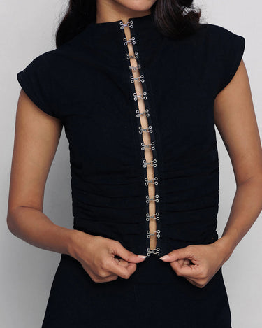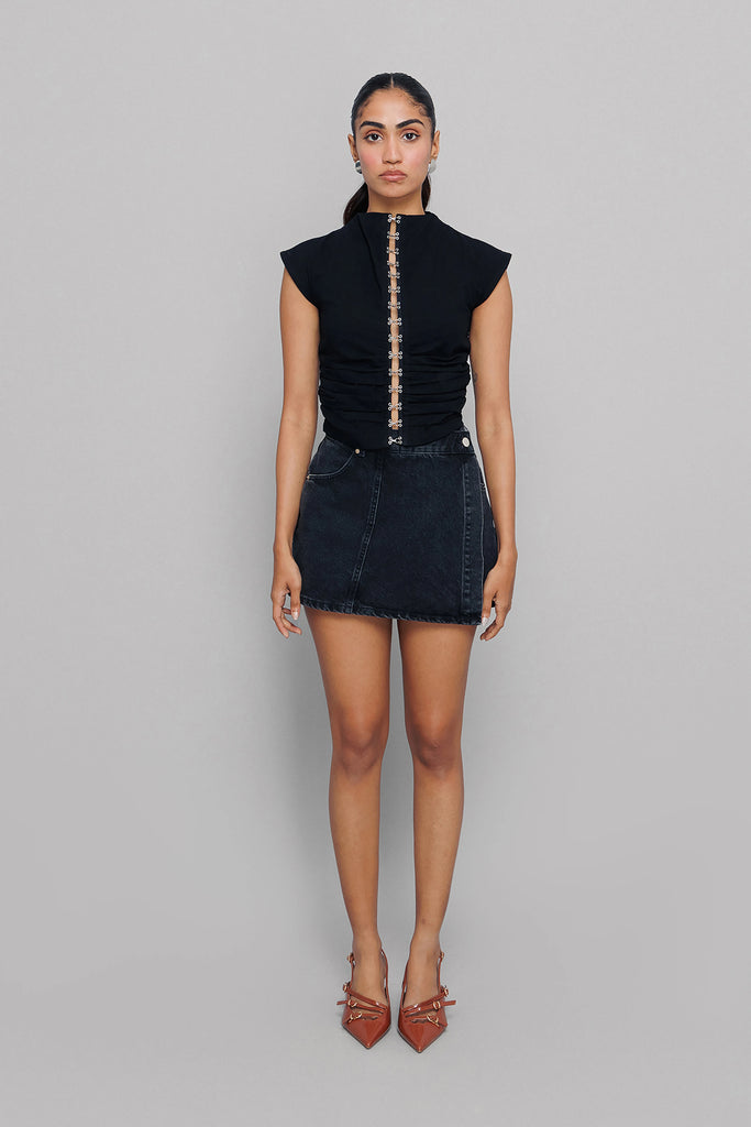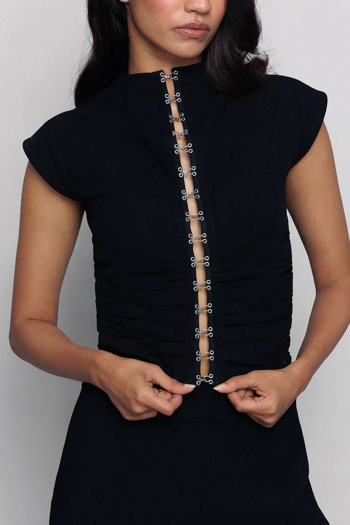 This black top features a beautiful hook detailing at the center, which elevates its simple structure into something much more stylish