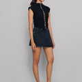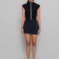 Features: Statement hook fastening, high neck, pleat detail at waist