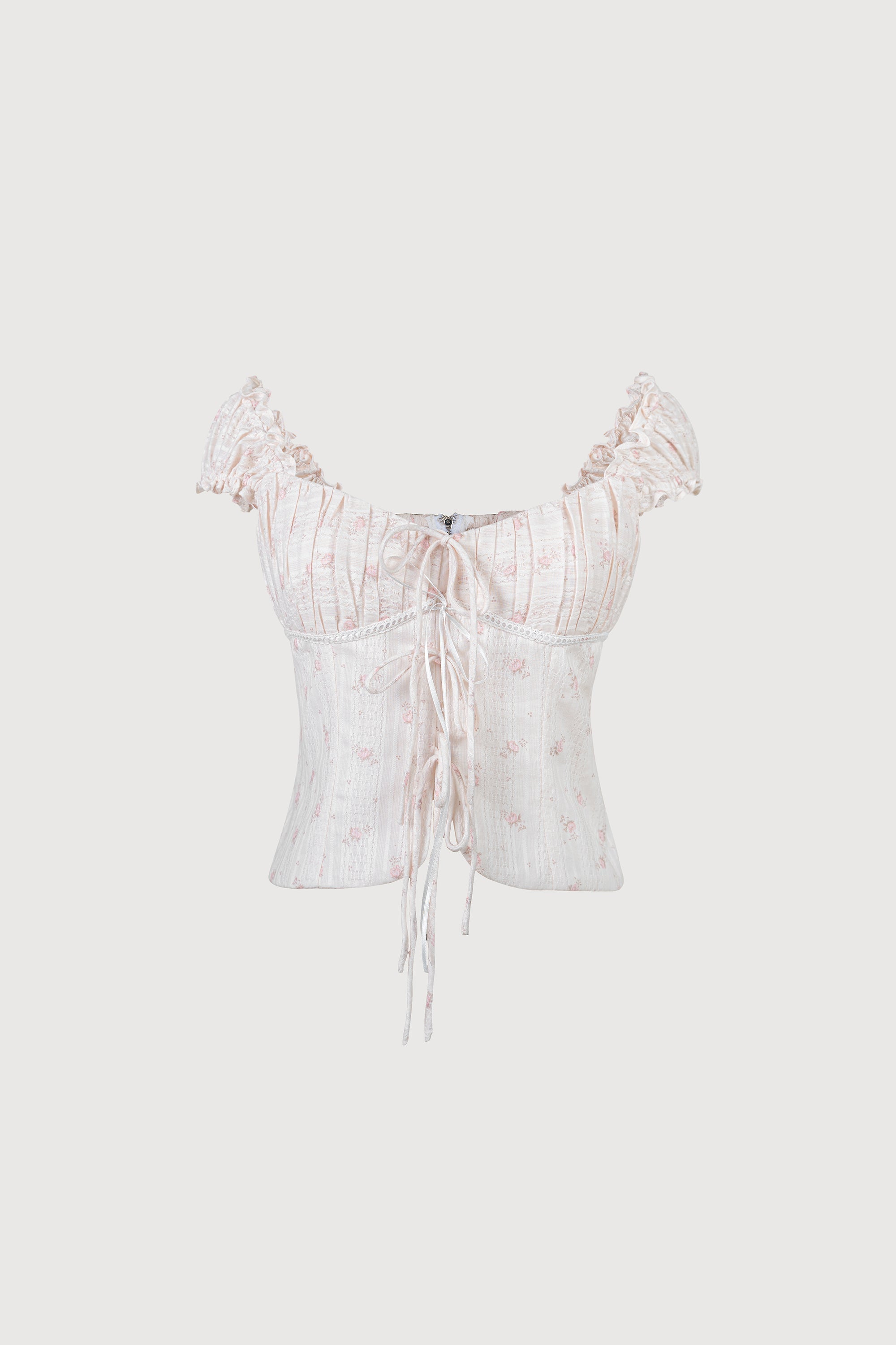 A romantic take on modern femininity. This off-shoulder cropped top features ruched detailing along the bust, delicate drawstring ties, and soft ruffled sleeves. Crafted in a lightweight fabric with subtle floral motifs, it highlights the neckline and waist with effortless charm.
