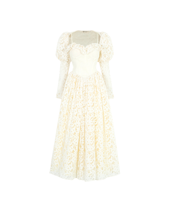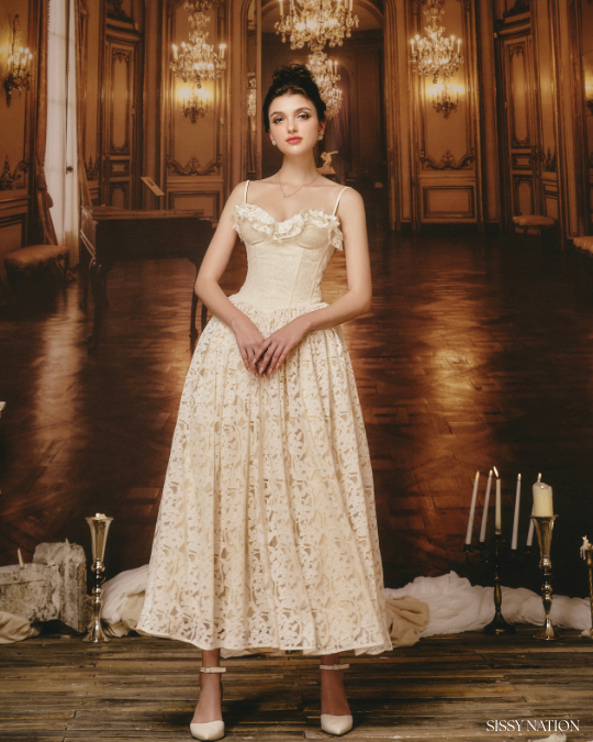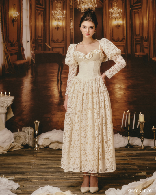 The soft cream color and pleated lace detail at the neckline add elegance and charm. The voluminous skirt creates a flattering silhouette that flows beautifully with every movement. Completing the look is a matching bolero jacket, adding an elegant layer that enhances the princess vibe.