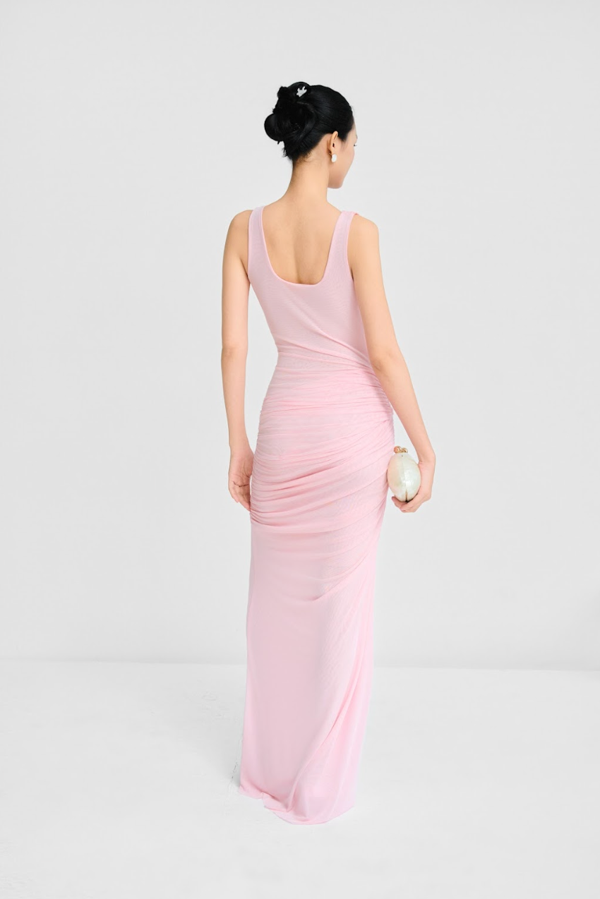 A masterpiece of dreamlike beauty, crafted from fabrics as ethereal as mist. The Mirage Gown features a bold, refined high slit designed to command attention with every step. Fluid layers of sheer tulle and shimmering sequins create a "liquid motion" effect, mimicking the grace of flowing water.
