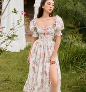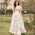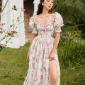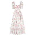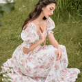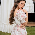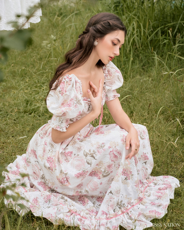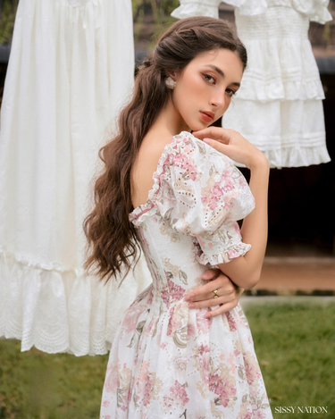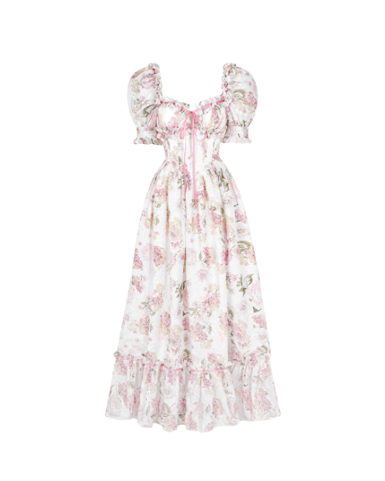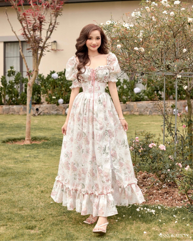 A fairytale in fabric, Miranda Floral Corset dress enchants with every detail. Rendered in a soft floral-pink tone, this puff-sleeve maxi dress captures the essence of romantic femininity. The corset-style bodice hugs the waistline, creating a flattering silhouette, while the gathered neckline and lace-up ribbon add a whimsical charm.