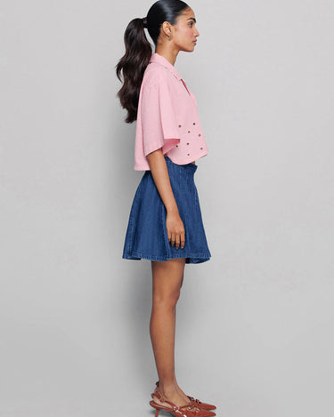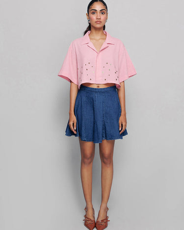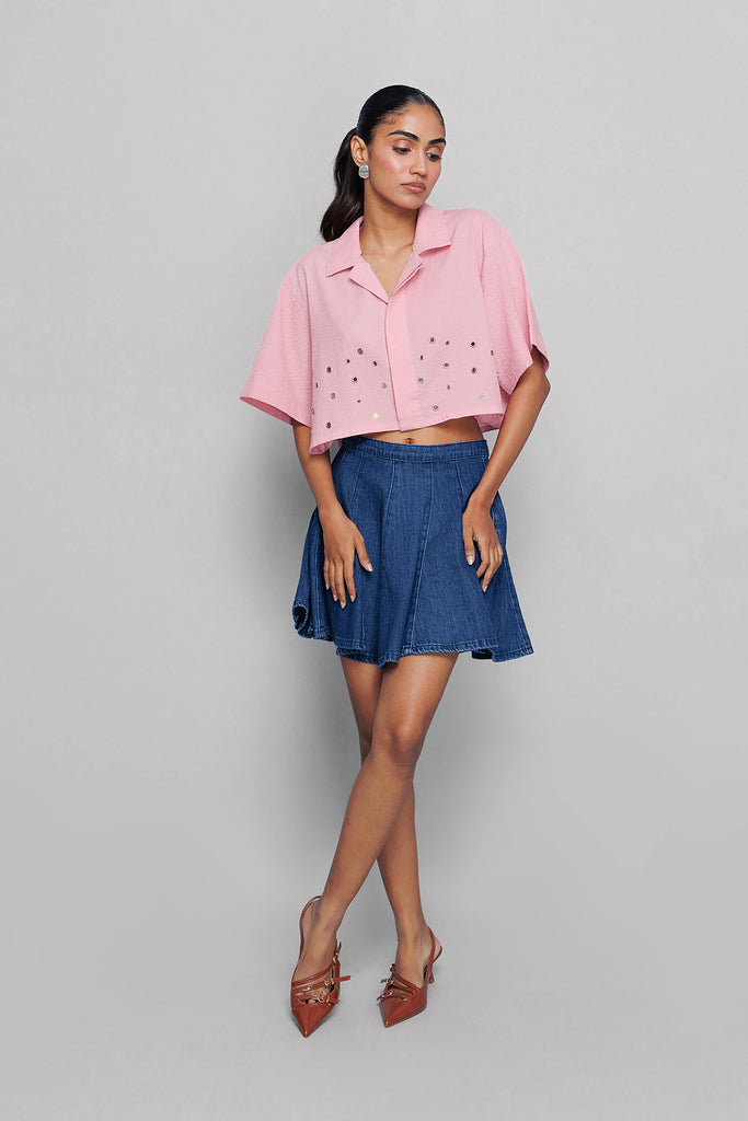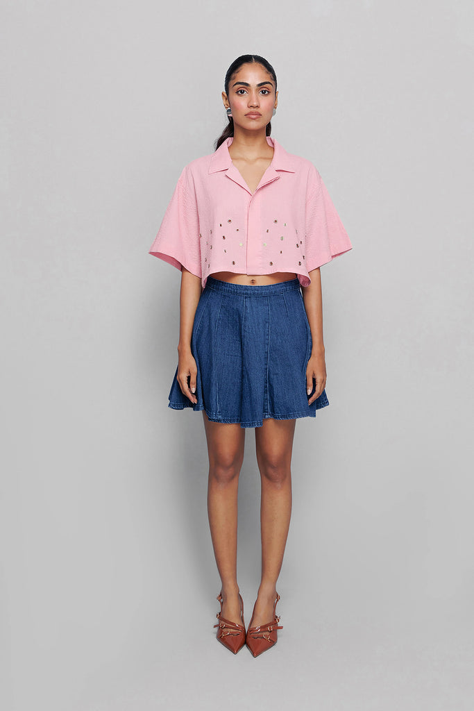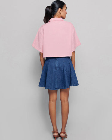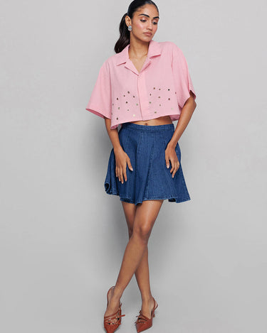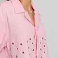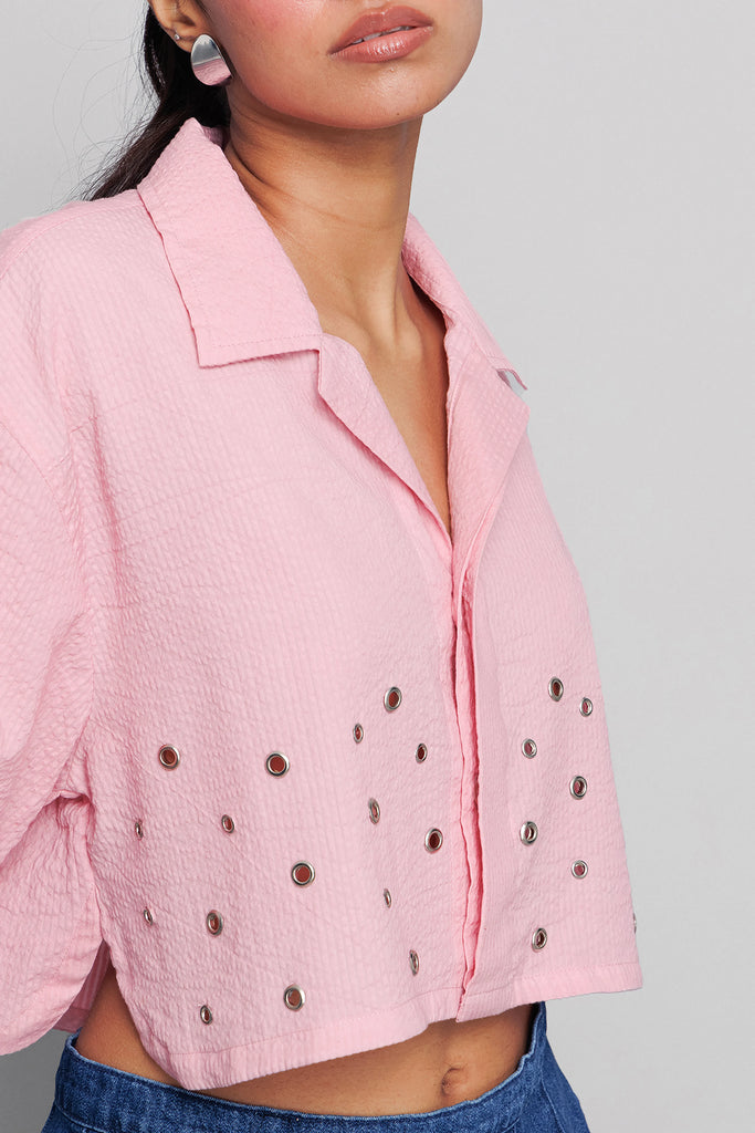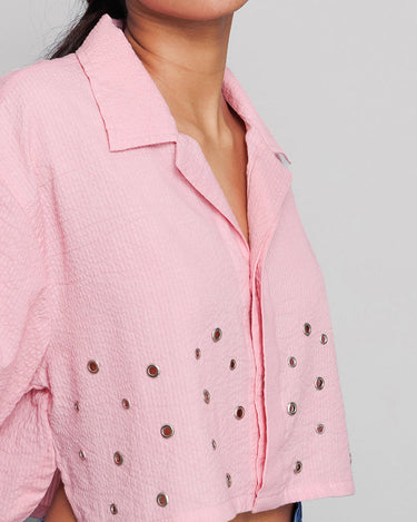 This pink shirt has fine accessory detailing and a collar, adding an element of sophistication. It’s perfect for a formal or smart-casual look