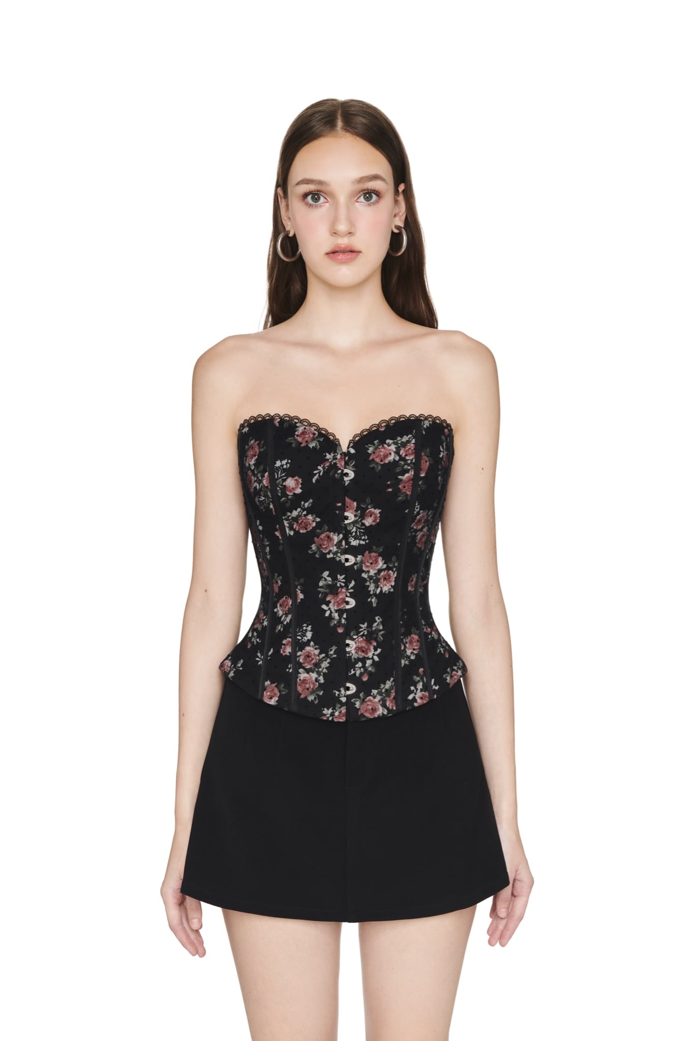 Rosewood' is made from a flower print fabric in a lovely black tone and fitted with internal boning to produce a sculptural design. It has a curved neckline and a shaped bust. Rosewood is fully lined for comfort and fastens to the front with hooks and eyes to be worn however you wish. The vivid black color looks particularly chic when paired with vintage jeans or our "Nayvie" skirt for a more glam look.