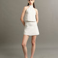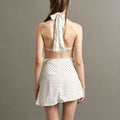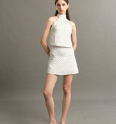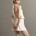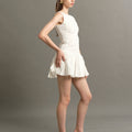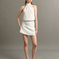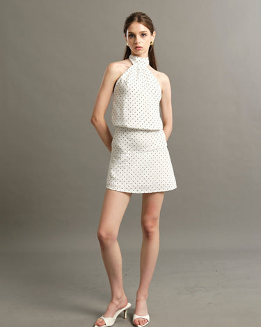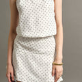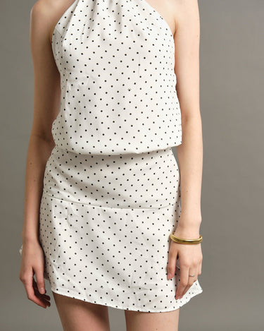 Made of a polyester blend and lined with 100% cotton. With an adjustable strap at the back to secure the dress. Has a puff waist and asymmetrical hem with a back zip